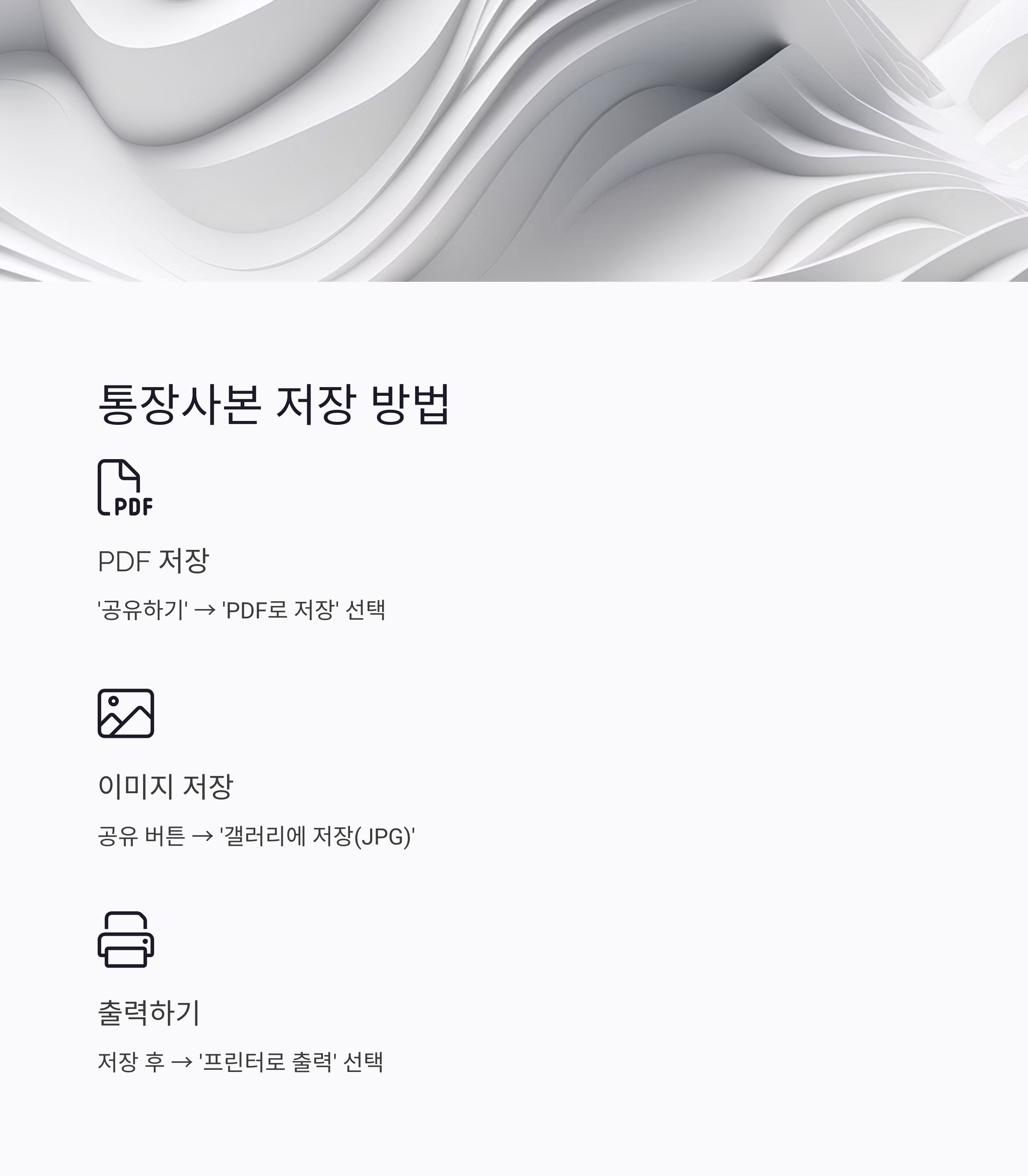 📌 요즘은 사진 파일 or PDF로 통장사본 요구하는 경우 많아서 모바일에서 바로 발급 + 저장 기능이 필수예요!