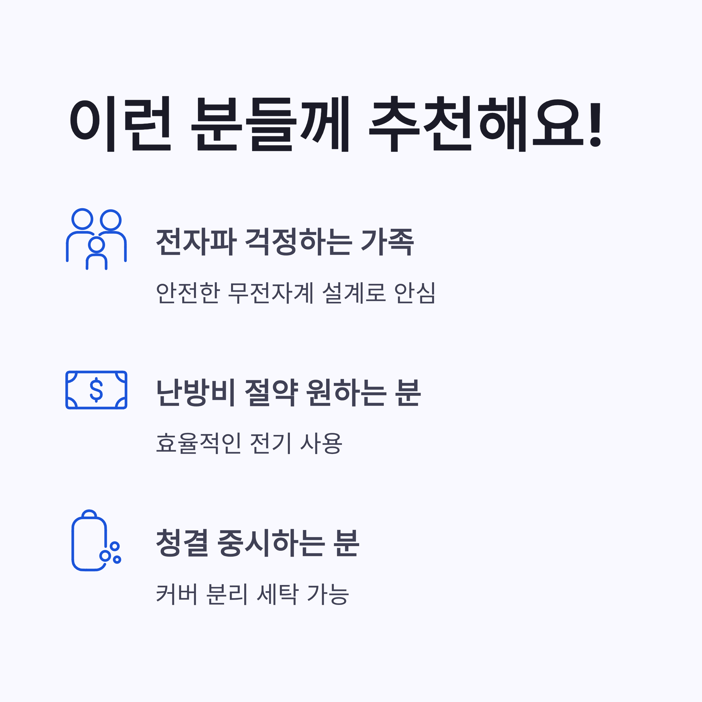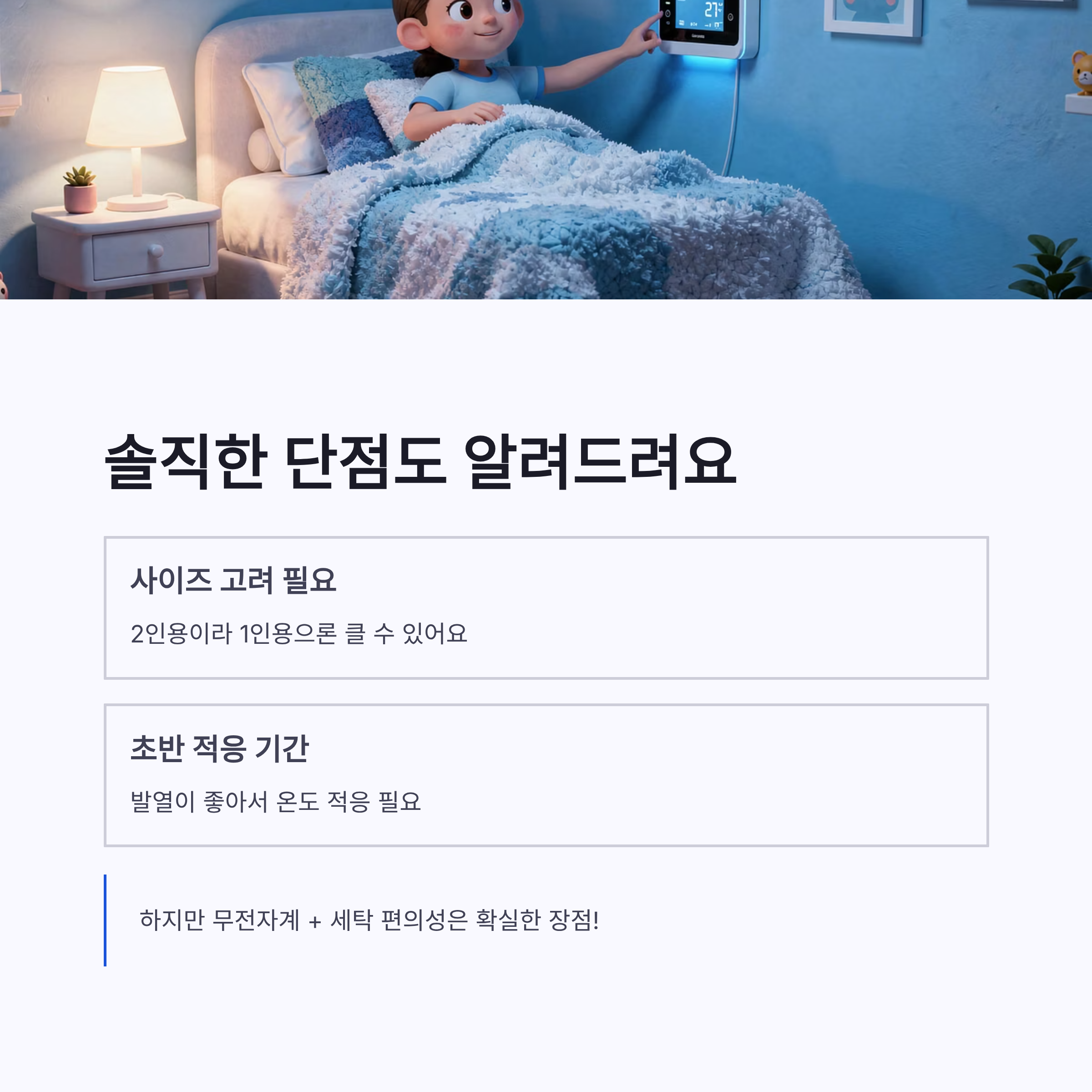 진짜 솔직하게 말하면, 장점은 전자파 없는 카본 그래핀, 양면 사용 가능, 9단계 디지털 조절, 세탁 커버 분리 라는 점들이에요. 특히 한일온열기 전기매트는 한겨울에도 침대 밖 나가기 싫게 만드는 마성의 따뜻함 ㅎㅎ 근데 단점은? 2인용이라 큰 침대엔 딱 좋지만, 1인용으로는 좀 클 수도 있고 발열이 워낙 좋아서 초반엔 적응이 필요했어요. 그래도 요즘 트렌드인 “무전자계 + 세탁 편의”는 진짜 큰 장점!