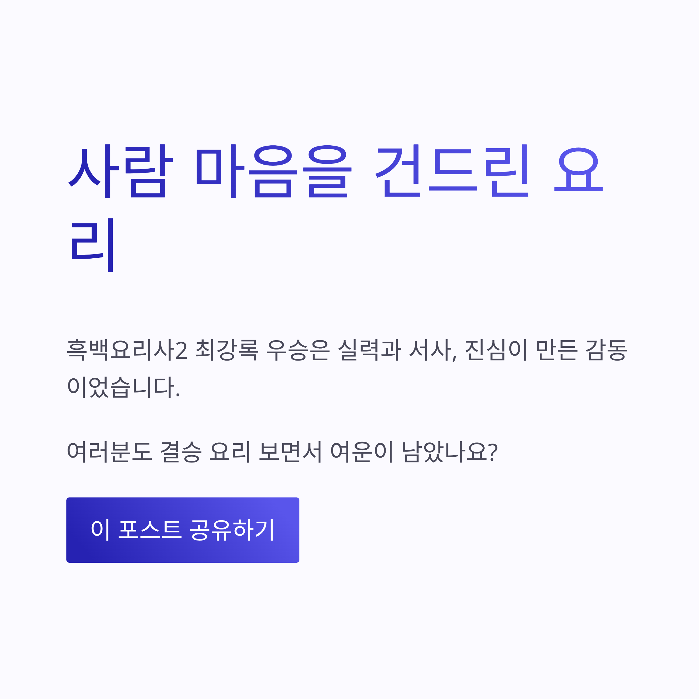 #흑백요리사2 #최강록우승 #흑백요리사2결승 #최강록셰프 #요리예능 #넷플릭스예능 #요리계급전쟁 #백수저우승 #요리사이야기 #재도전스토리 #요리서사 #결승전리뷰 #요리감동 #예능리뷰 #2026넷플릭스