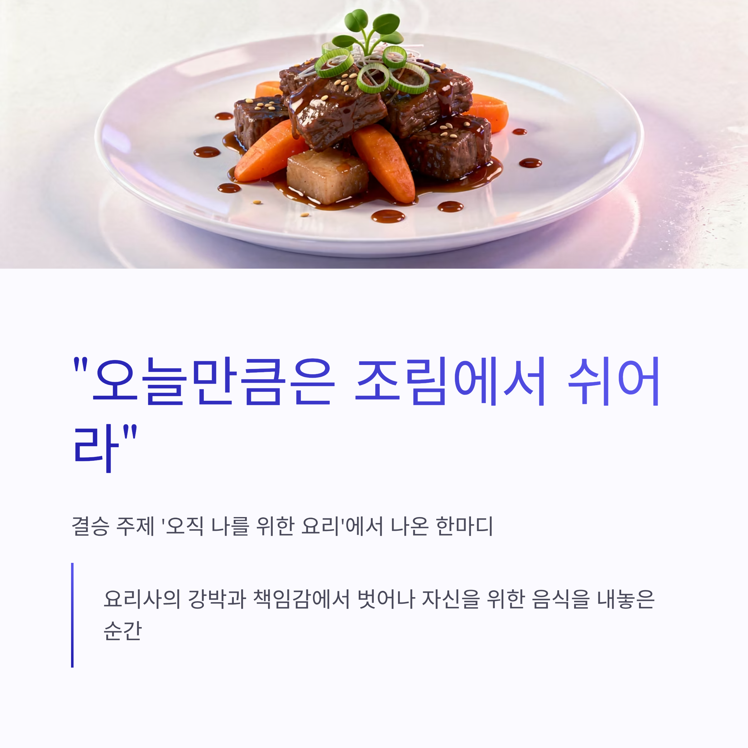 시즌2 내내 느낀 건 최강록 셰프가 확실히 달라졌다는 점이었어요. 예전엔 기술이 먼저였다면, 이번엔 사람을 위한 요리가 앞에 있더라구요. 결승 주제가 ‘오직 나를 위한 요리’였는데, 그가 꺼낸 한마디. “오늘만큼은 조림에서 쉬어라” 이 말이 이상하게 오래 남았습니다. 요리사로서의 강박, 반복, 책임감에서 잠깐 벗어나 자신을 위한 음식을 내놓았다는 느낌이랄까요. 흑백요리사2 최강록 우승이 단순한 실력 문제가 아니었다는 게 여기서 느껴졌어요.