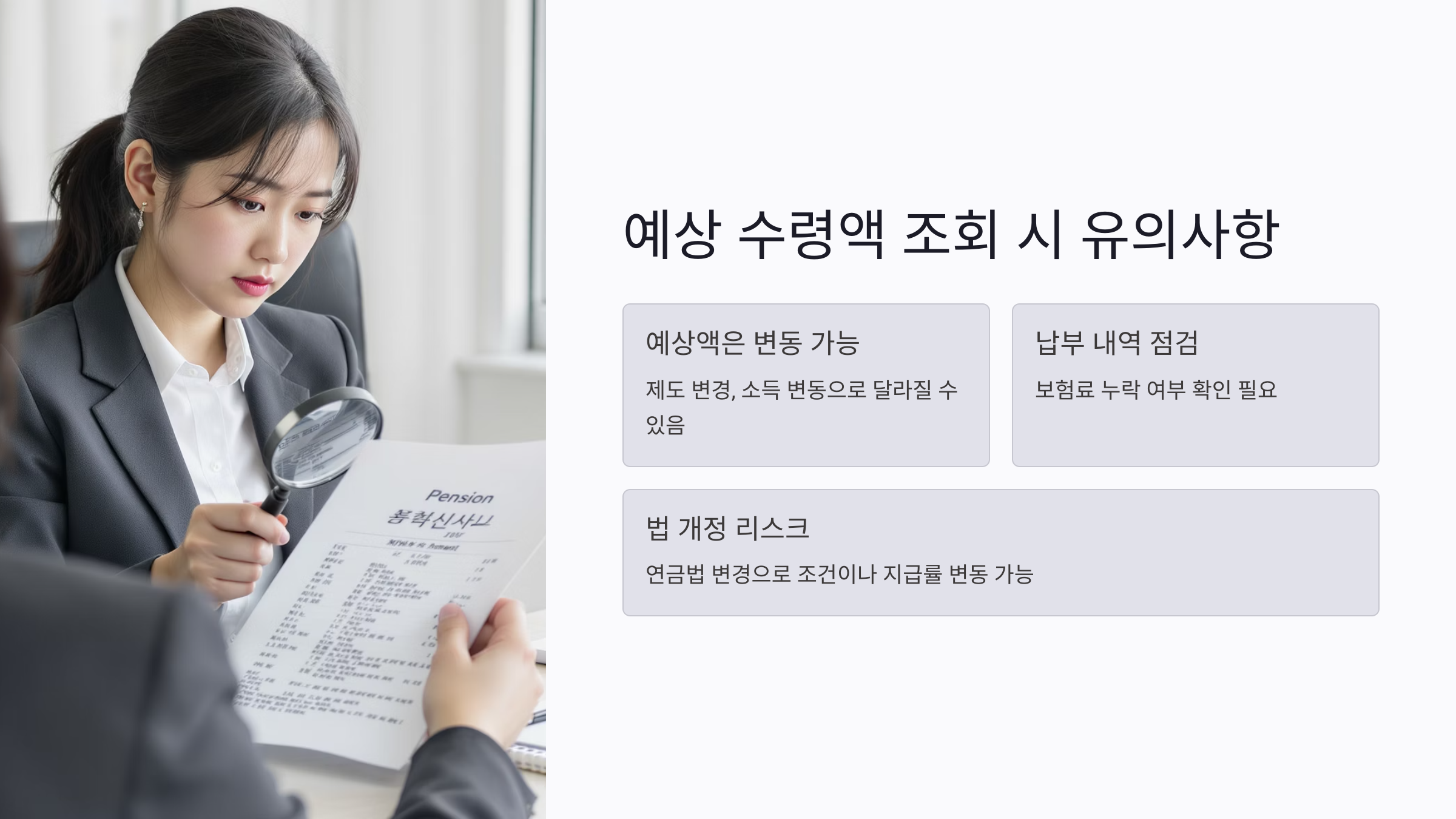 - 법 개정 리스크 고려: 연금법 개정으로 수령 조건이나 지급률 변경 가능성 있음