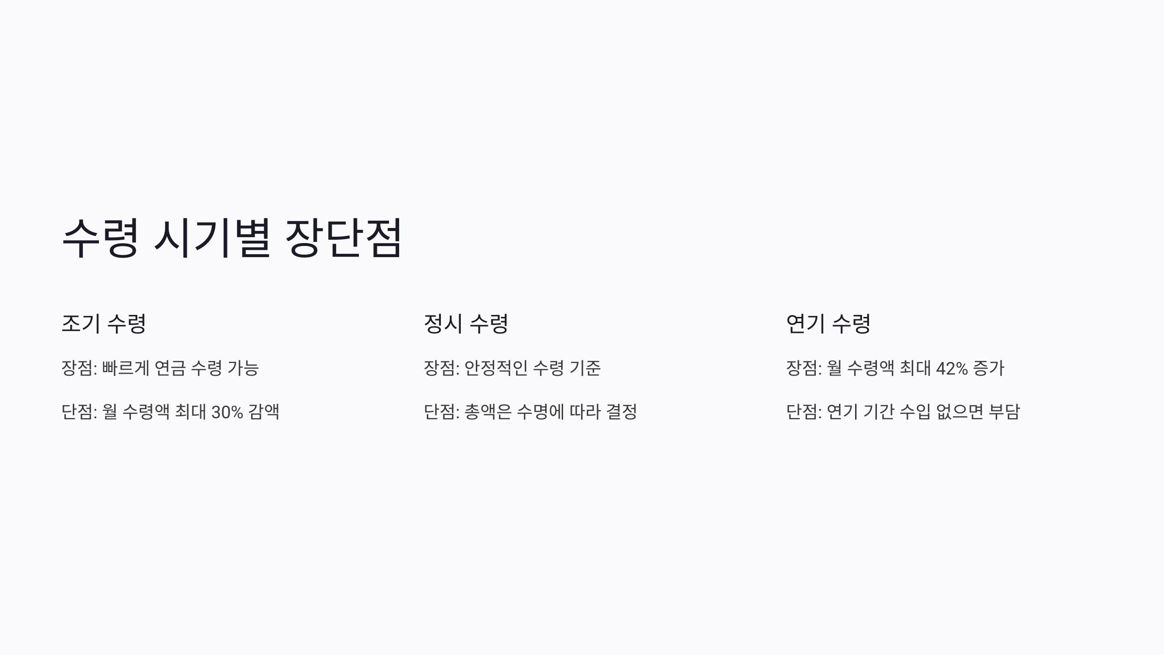 | 수령 시작 시점 | 조기수령 시 감액, 연기수령 시 최대 42% 가산됨 |