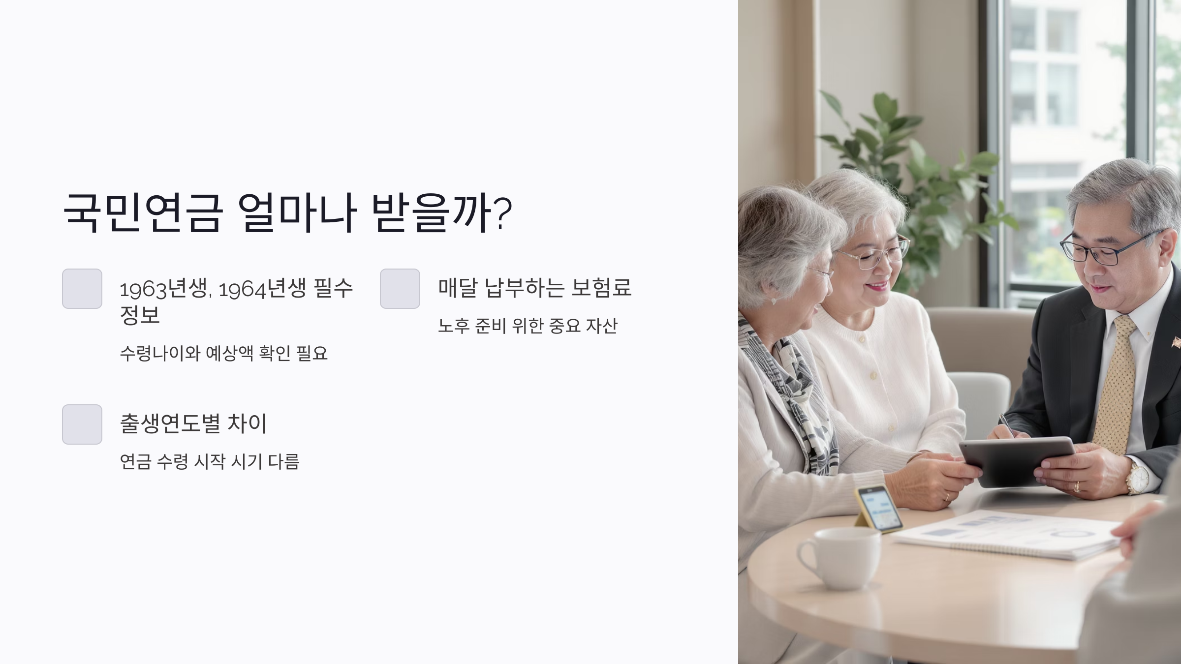 특히 1963년생과 1964년생이라면 연금 수령 시작 시기가 조금씩 다르기 때문에, 지금 꼭 확인해두셔야 해요. 이 글에서는 예상 수령액 조회 방법부터 나이에 따른 수령 전략까지 한 번에 정리해드립니다.