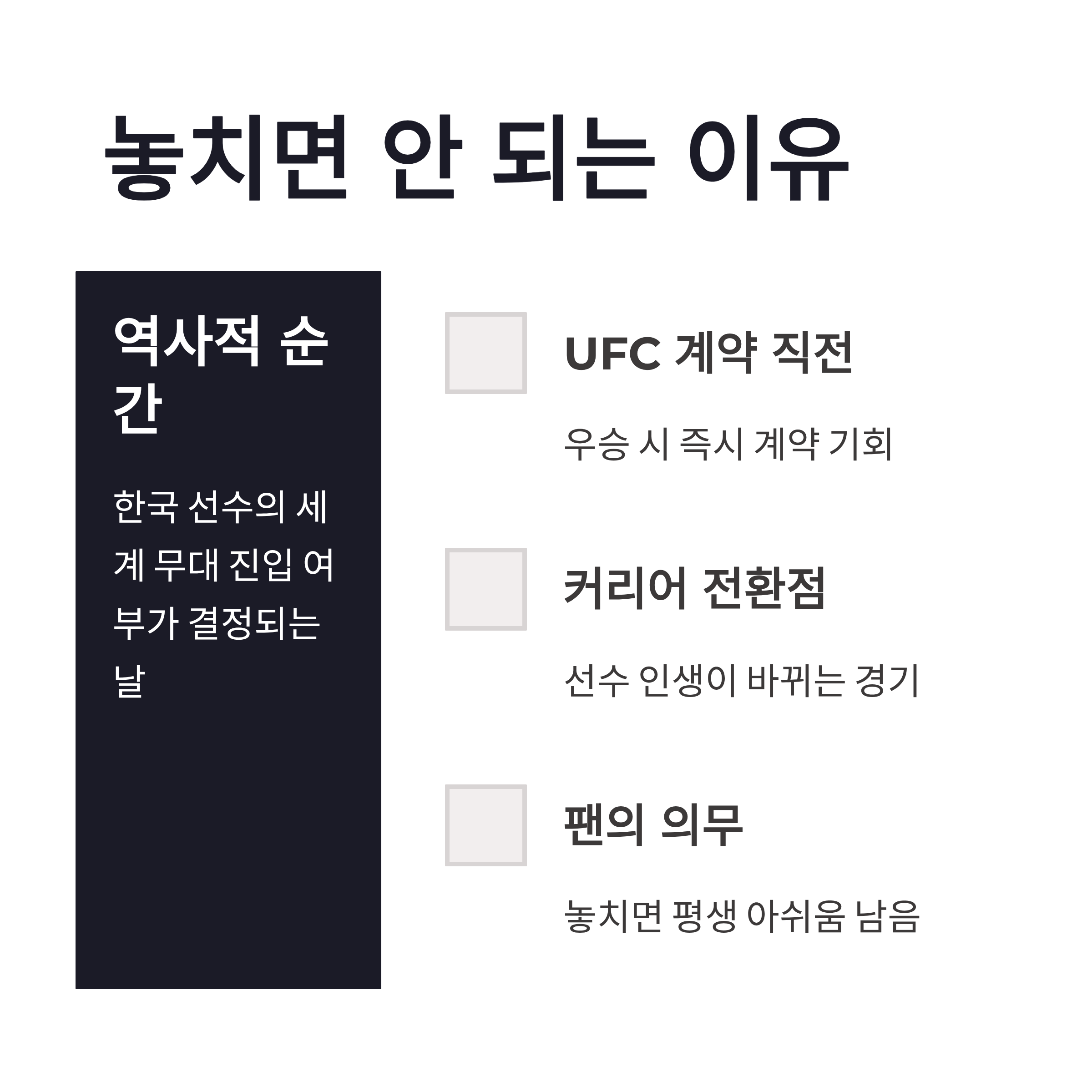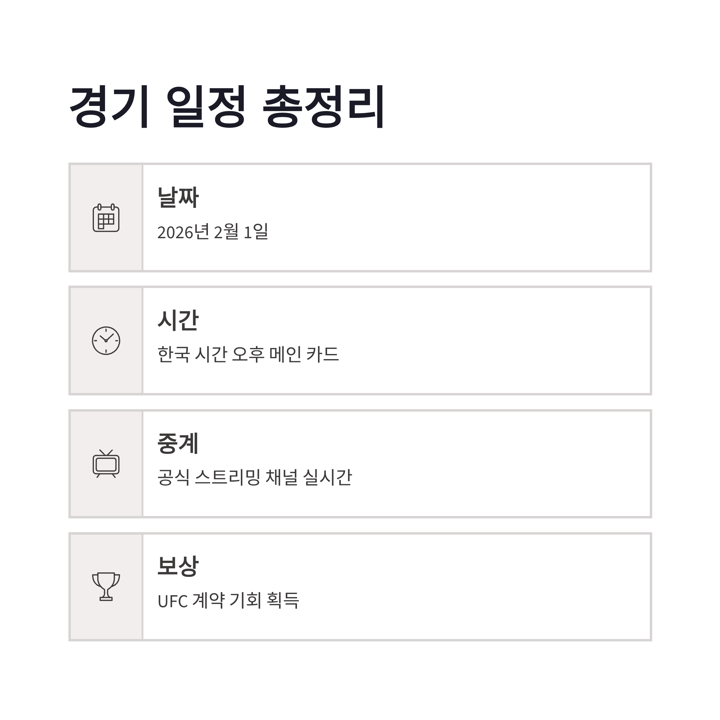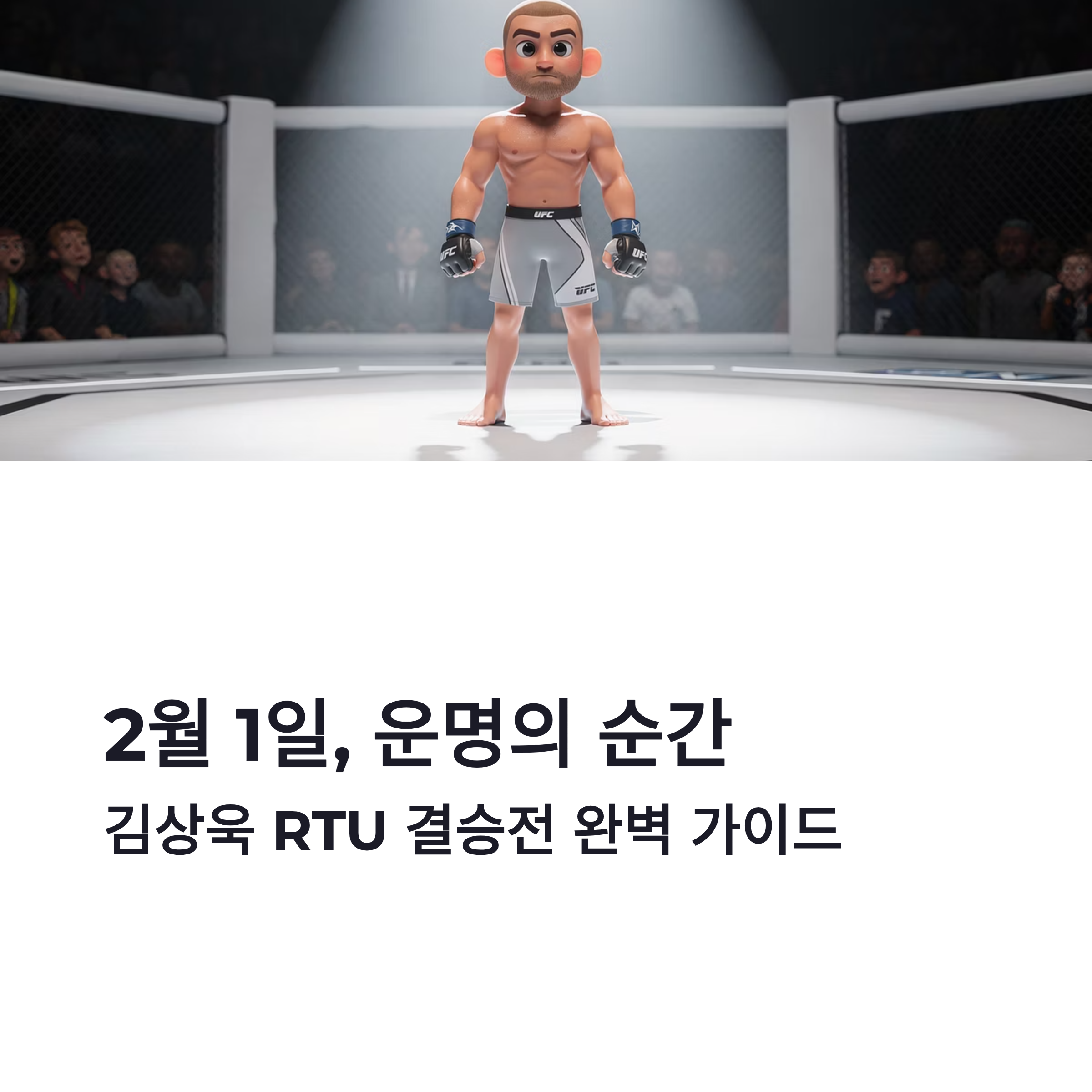 드디어 기다리던 날이 코앞입니다. 김상욱 RTU 결승전이 2월 1일에 열리는데요, 저도 이 소식 듣고 달력부터 체크했구요 ㅎㅎ RTU는 아시아 파이터들이 UFC로 가기 위해 마지막으로 통과해야 하는 관문 같은 무대라서, 결승이라는 단어 자체가 주는 무게감이 다르더라구요. 이번 김상욱 RTU 결승은 단순한 경기 하나가 아니라, 선수 인생이 확 바뀔 수도 있는 순간이라 더 긴장됐습니다. 경기 시간은 한국 시간 기준으로 오후 라인업 중 메인 카드에 배치될 가능성이 높고, 현지 일정에 따라 약간의 변동은 있을 수 있겠더라구요. 김상욱 RTU 결승전은 실시간 중계로 봐야 진짜 맛이 납니다. 현장 텐션이 그대로 느껴지거든요. 솔직히 이건 다시보기로 보면 감정이 반감됩니다. 진짜입니다.
