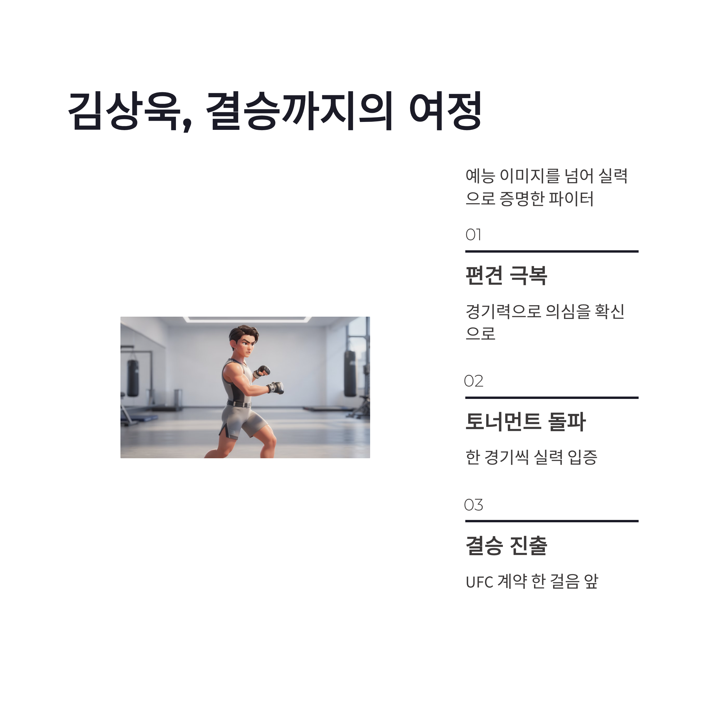 RTU는 Road to UFC의 약자고, 말 그대로 살아남는 사람만 다음으로 가는 구조예요. 이 대회에서 우승하면 UFC와 계약할 수 있는 기회를 얻게 되는데, 이게 얼마나 빡센지 알 사람은 다 알죠. 김상욱 RTU 결승까지 올라왔다는 것 자체가 이미 증명입니다. 예능에서 먼저 얼굴을 알린 이미지 때문에 가볍게 보는 시선도 있었는데, 실제 경기 내용 보면 그런 말 쏙 들어가요. 저도 초반엔 반신반의했는데, 한 경기 한 경기 보면서 생각이 완전 바뀌었거든요.