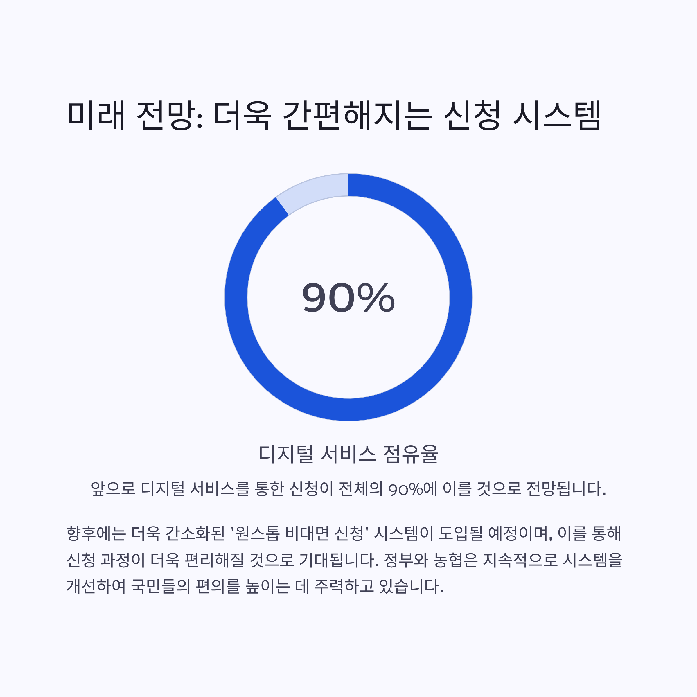 향후에는 디지털 취약계층을 위한 ‘찾아가는 신청 서비스’와 오프라인 창구가 강화될 예정이며, 정부와 농협은 이에 따른 현장 인력을 하반기에 10% 이상 증원할 계획입니다[3]. 디지털 서비스의 시장 점유율이 90%에 이를 전망이며, 앞으로는 더욱 간소화된 ‘원스톱 비대면 신청’ 시스템 도입이 예상됩니다.