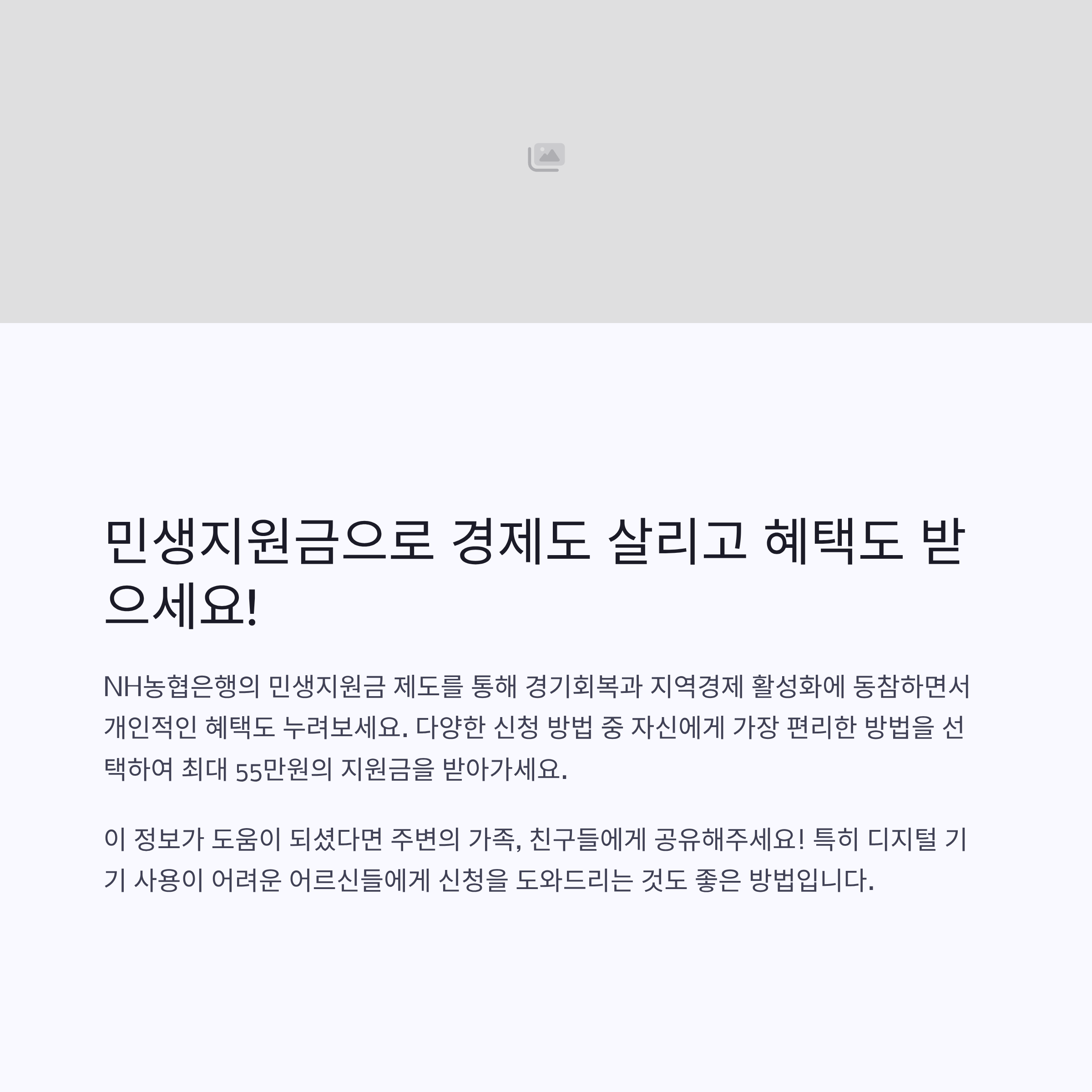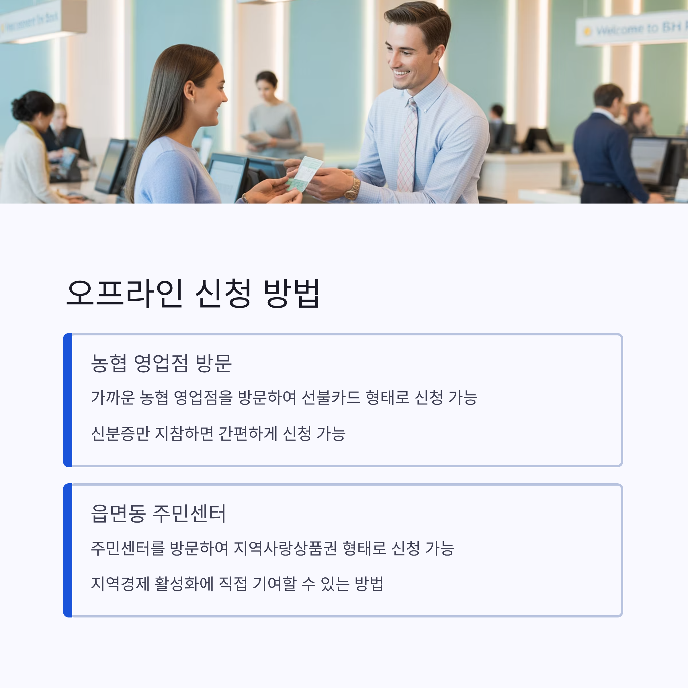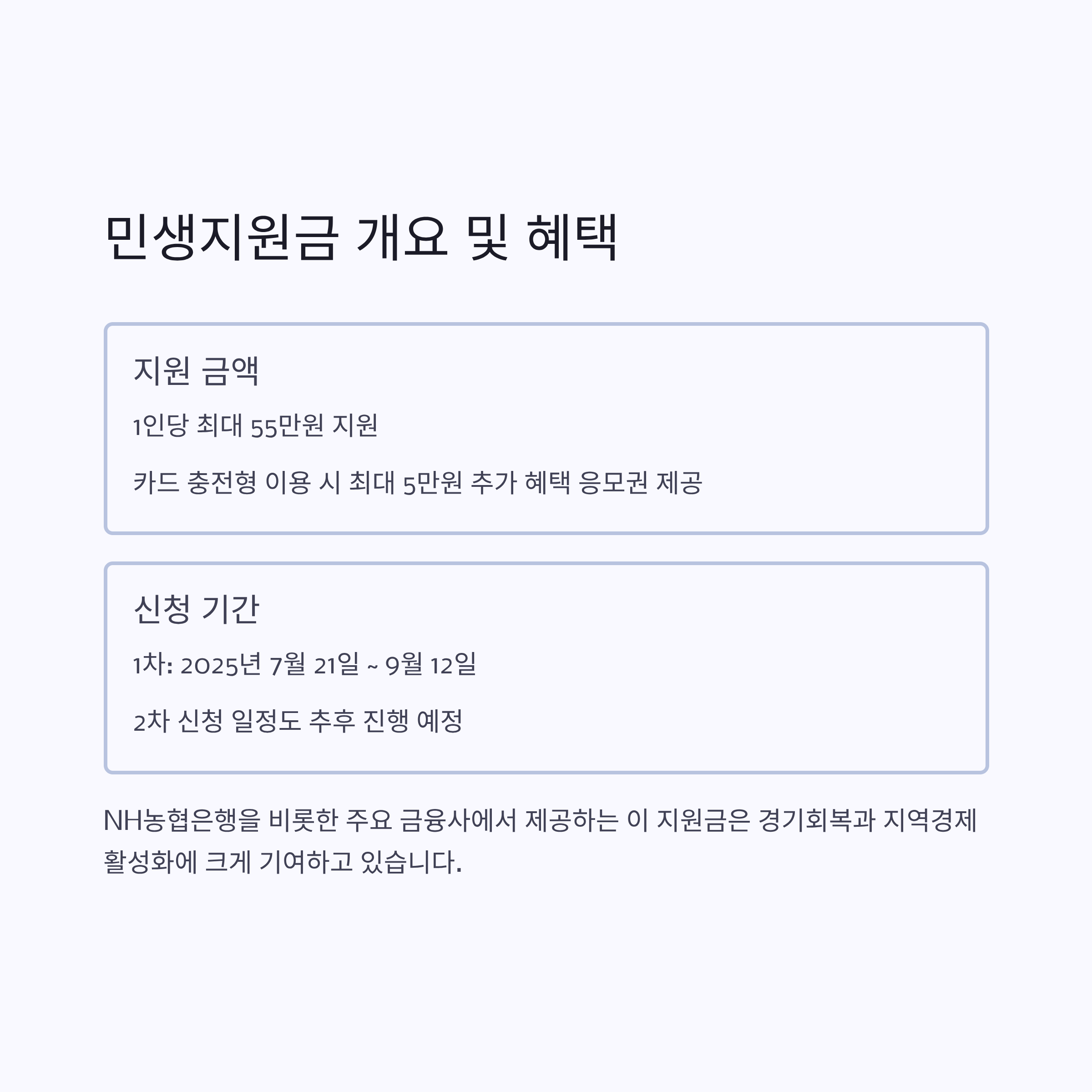 이번 민생지원금은 1인당 최대 55만 원으로, 카드 충전형 이용 시 최대 5만 원의 추가 혜택 응모권이 제공됩니다. 신청은 오는 7월 21일부터 9월 12일까지 진행되며, 이어서 2차 신청 일정도 잡혀 있어 여유가 있습니다[5]. 주된 신청 방법으로는 NH Pay 앱 및 9개 카드사의 모바일/웹을 통한 신청이 가능하며, 간편결제 서비스와 인터넷은행을 통한 신청도 제공됩니다[2][3][1]. 오프라인에서는 농협 영업점과 읍면동 주민센터를 방문하여 선불카드 혹은 지역사랑상품권 형태로 신청할 수 있습니다.