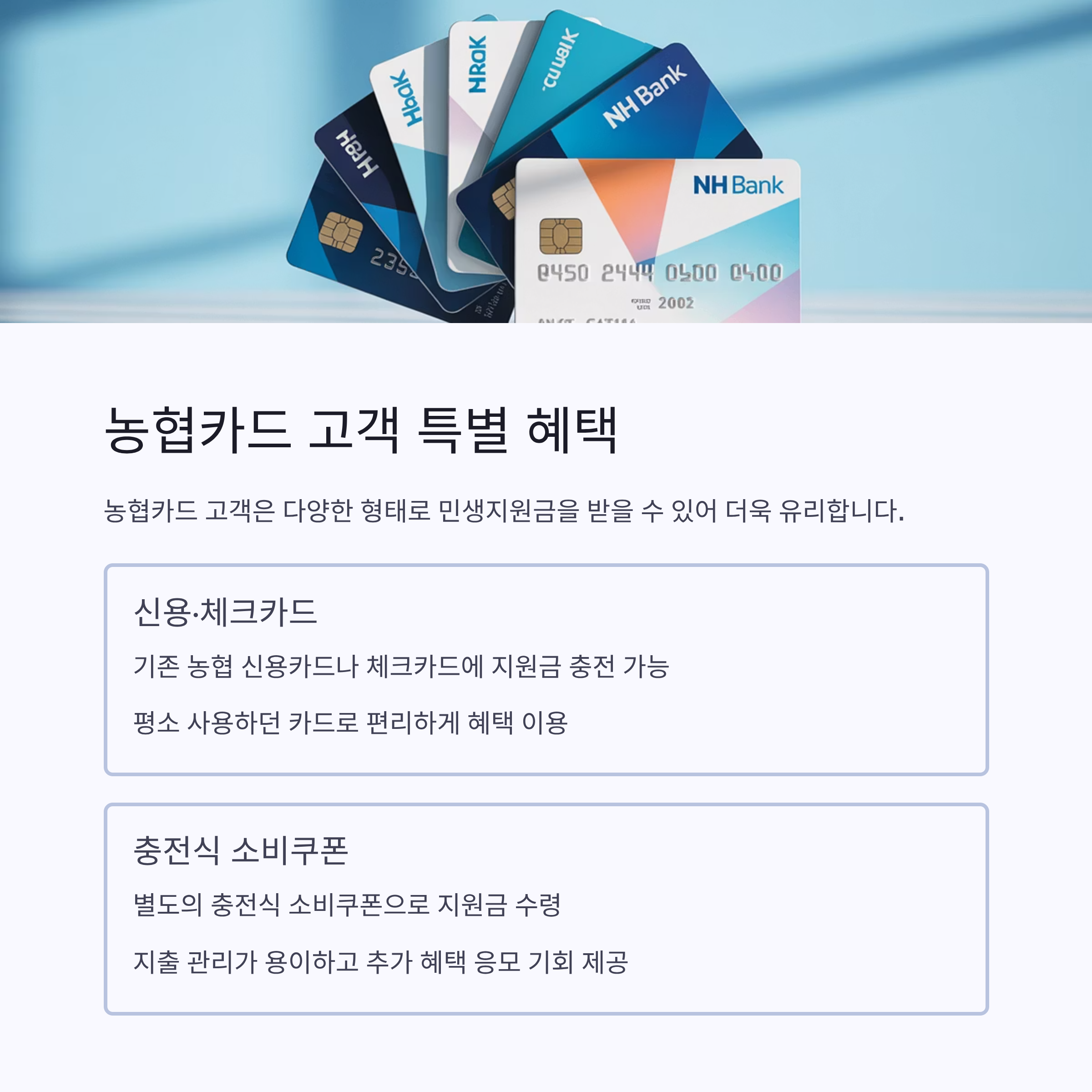 정부의 2025년 민생회복 정책에 따라 NH농협은행을 비롯한 주요 금융사에서 제공하는 ‘민생회복 소비쿠폰’은 경기회복과 지역경제 활성화에 크게 기여하고 있습니다. 이번 지원금은 온라인과 오프라인 모두에서 간편하게 신청할 수 있어 많은 이들의 관심을 받고 있습니다. 특히 농협카드 고객은 신용·체크카드나 충전식 소비쿠폰 등 다양한 형태로 지원금을 받을 수 있습니다.