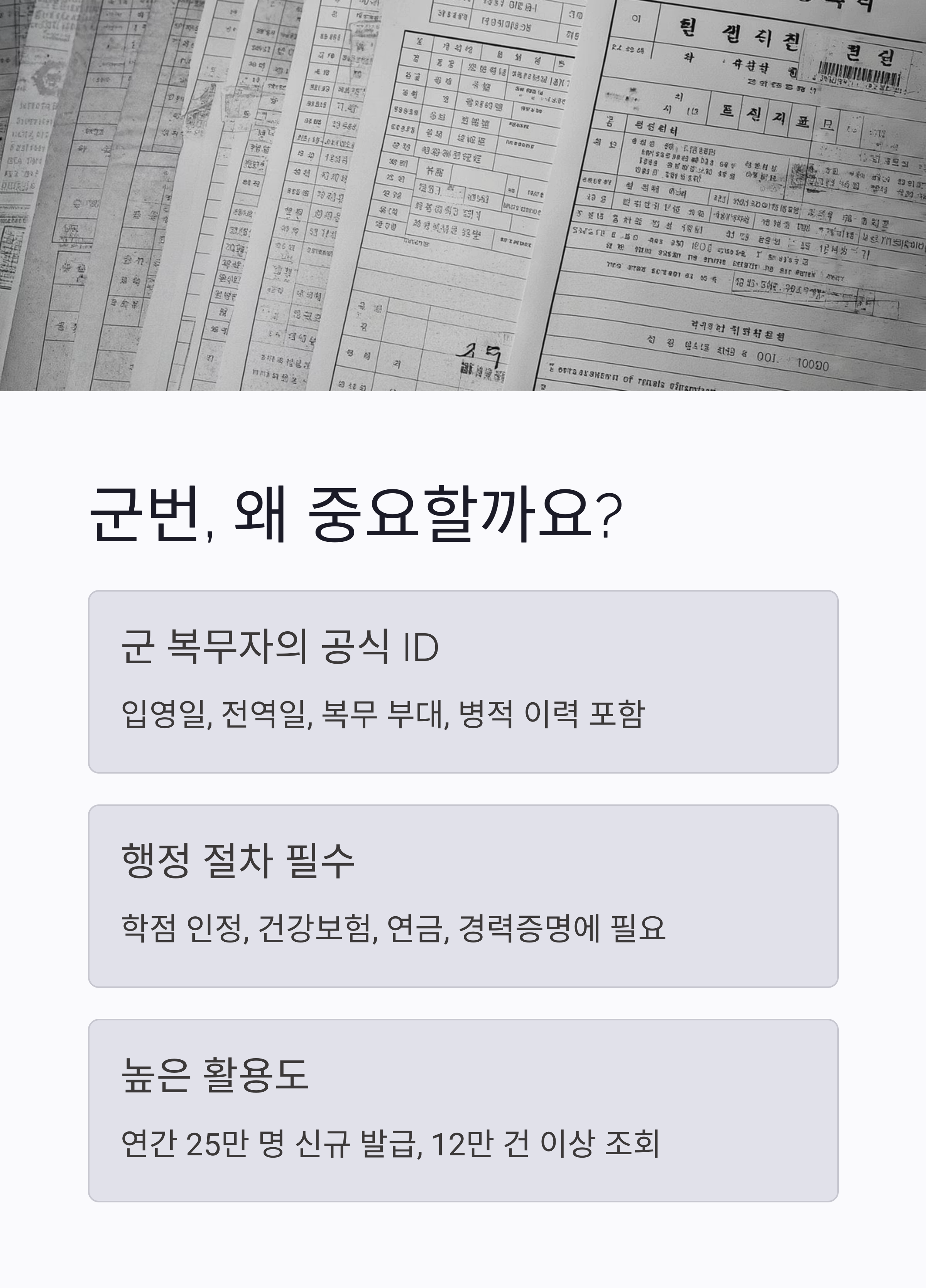2025년 기준으로 매년 25만 명 이상이 신규 군번을 받고 있고, 12만 건 이상이 조회될 정도로 활용도도 어마무시합니다.