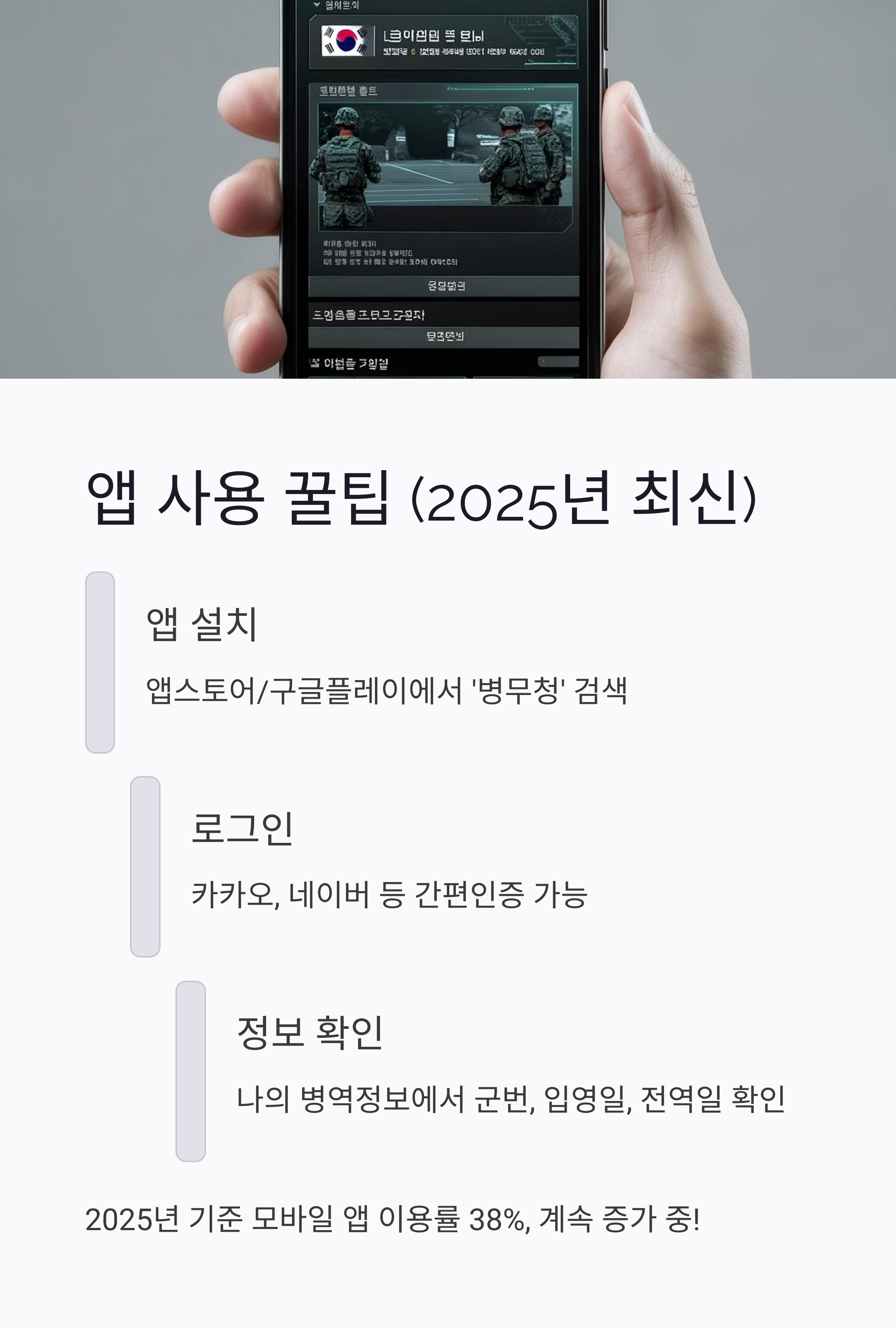 | 병무청 모바일 앱 | 안드로이드/iOS | 간편인증 (카카오/네이버) | 즉시 | ‘나의 병역정보’에서 바로 확인 |