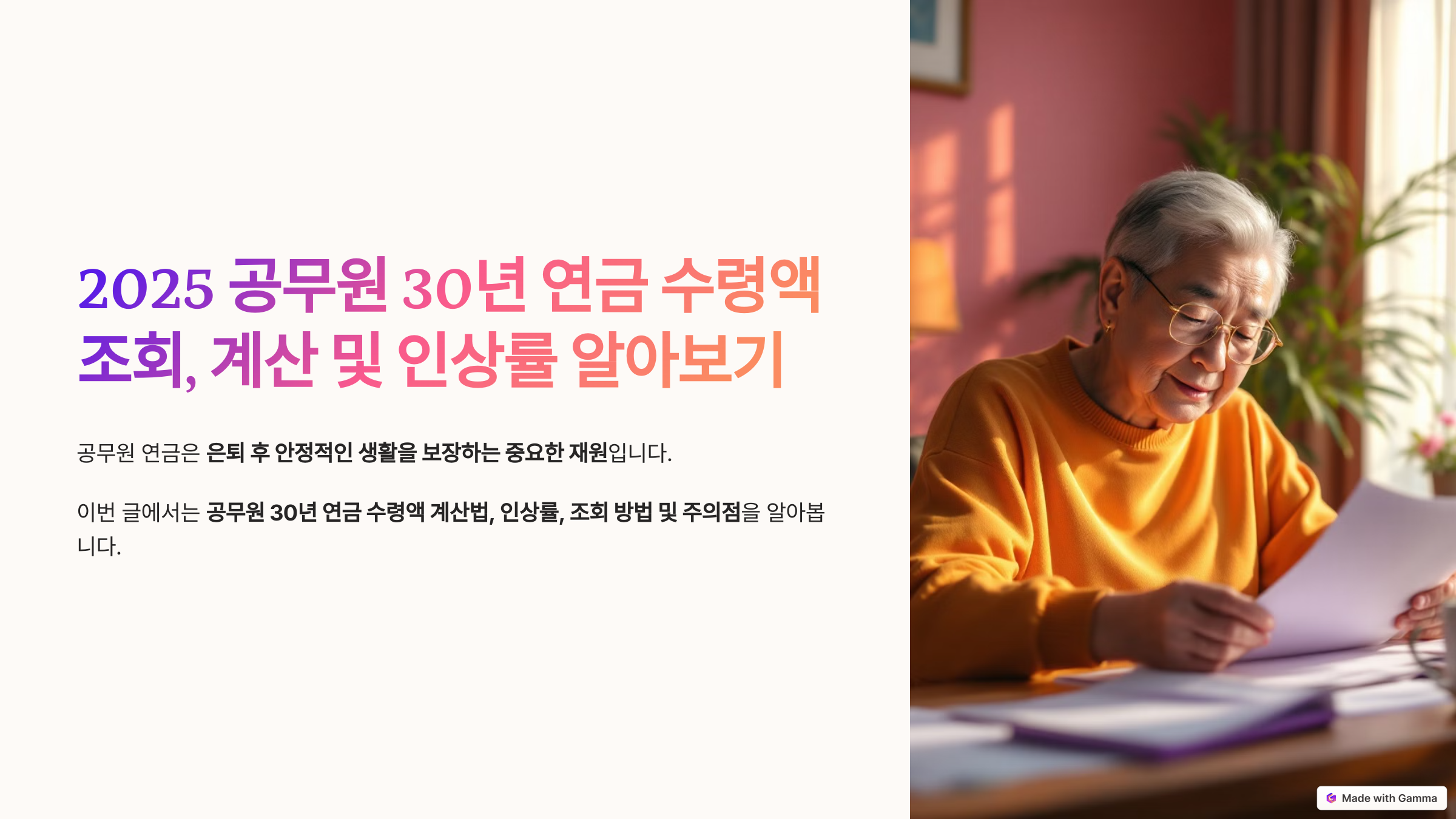 이번 글에서는 공무원 30년 연금 수령액 계산법, 인상률, 조회 방법 및 연금을 받을 때 주의할 점까지 자세히 알아보겠습니다.