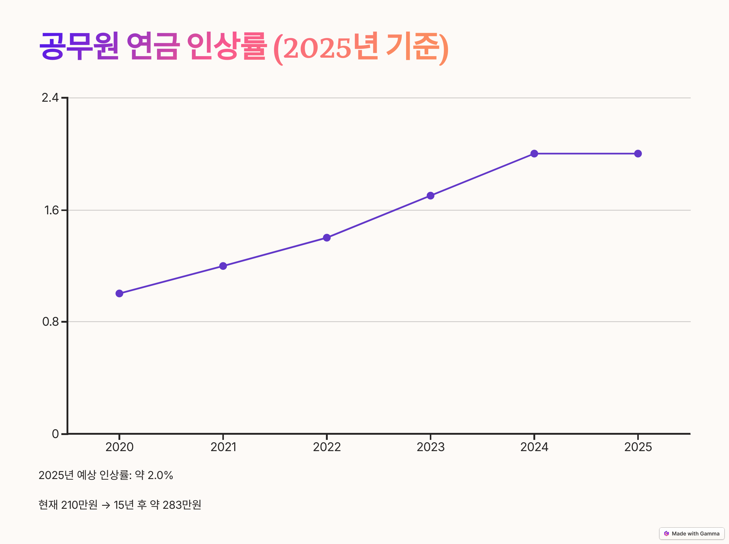 ✔ 현재 연금이 210만 원이라면, 매년 2%씩 인상될 경우