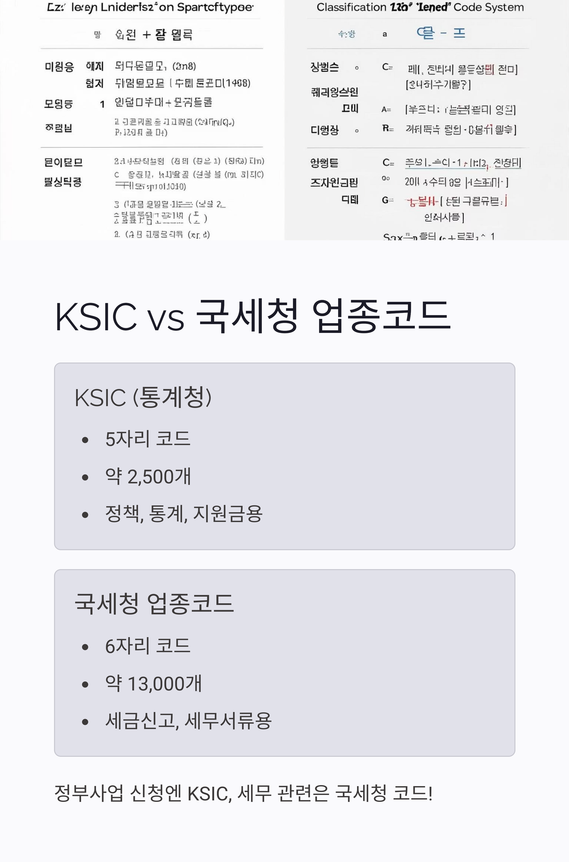 정부지원·사업자등록은 KSIC, 세무신고는 국세청 업종코드 사용해요.