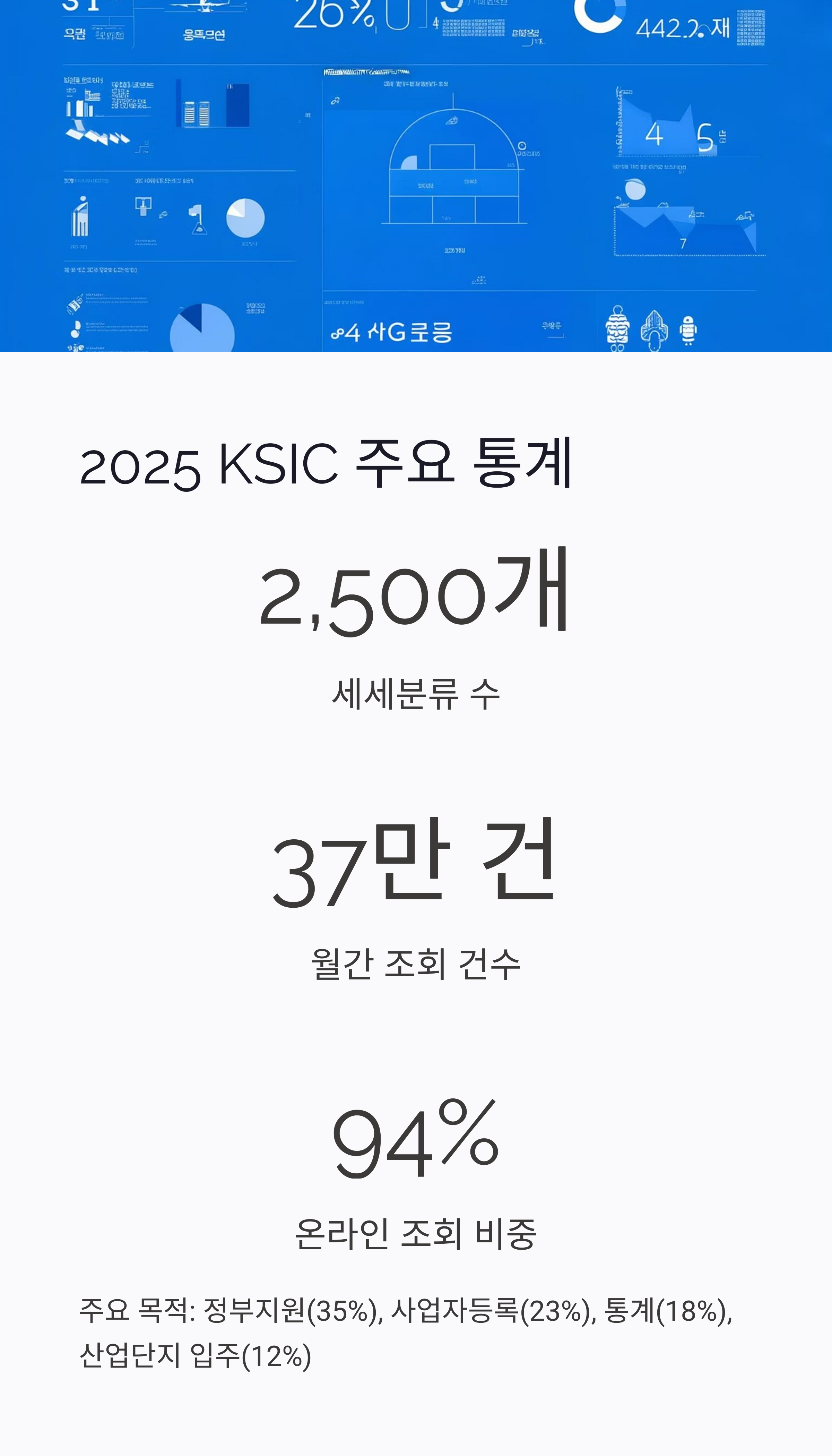 | 주요 목적 | 정부지원(35%), 사업자등록(23%), 통계(18%), 산업단지 입주(12%) |