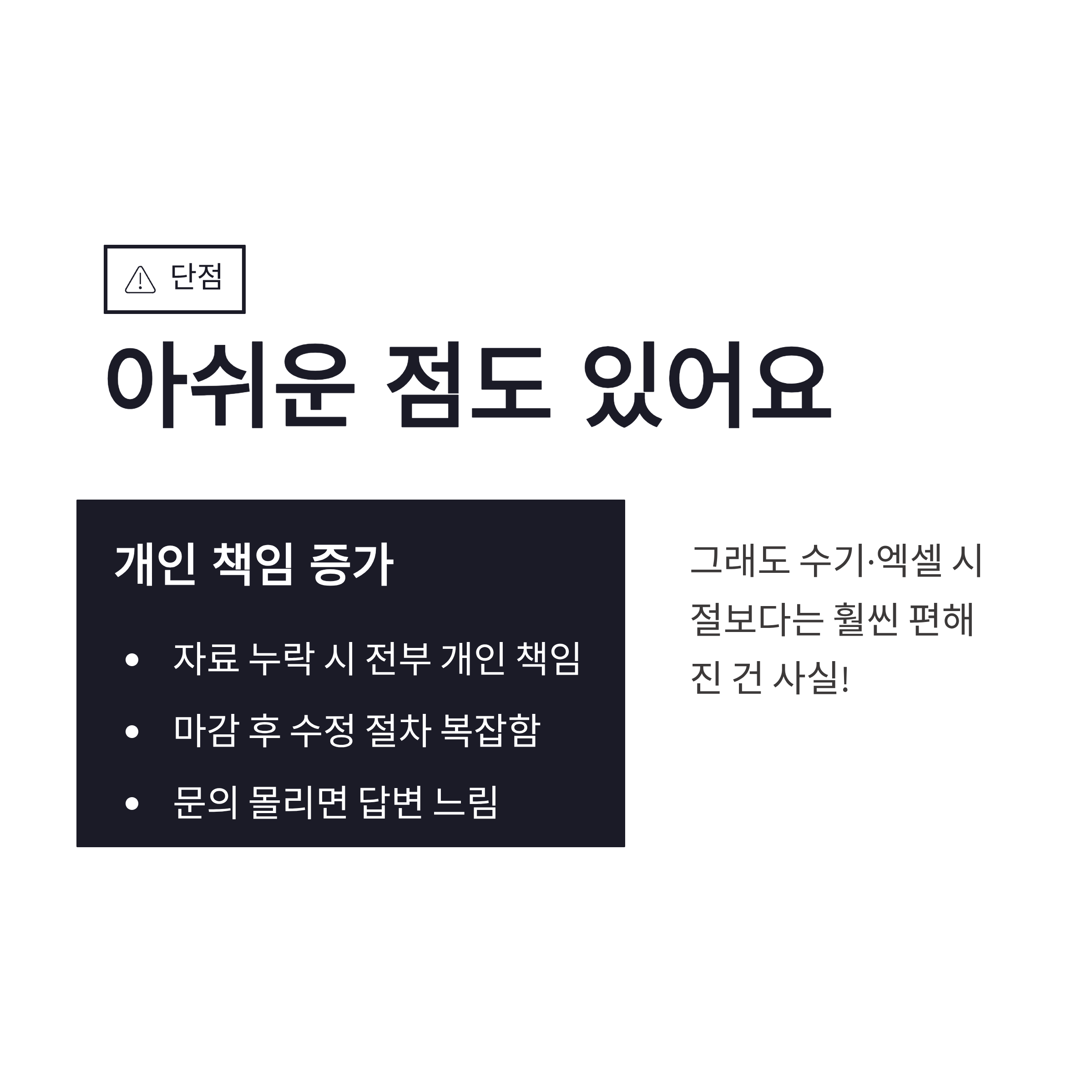 * 자료 누락 시 전부 개인 책임 * 마감 이후 수정 절차 번거로움 * 문의 몰리면 답변 속도 느림