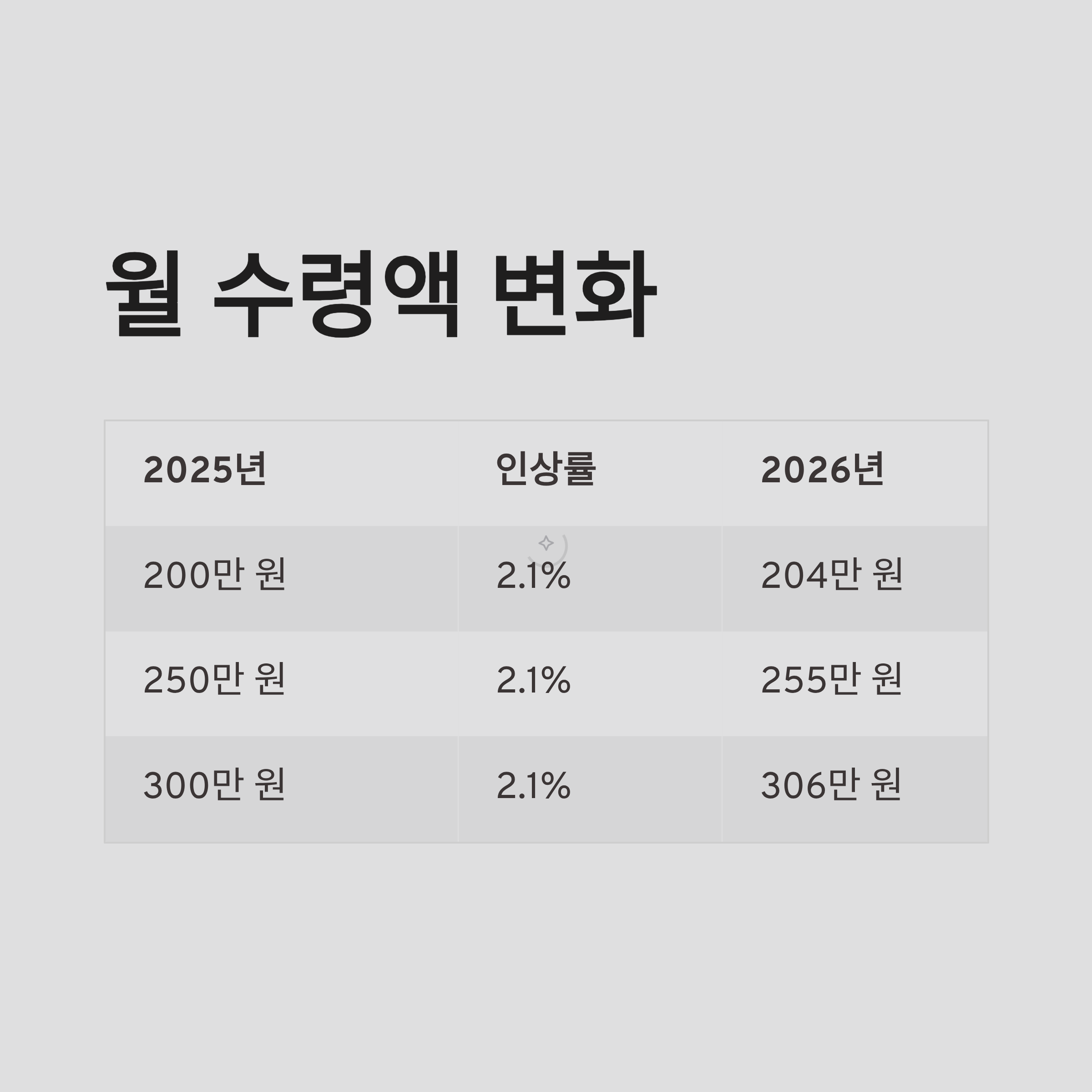 | 2025년 월 수령액 | 2026년 인상률 | 2026년 예상 수령액 |