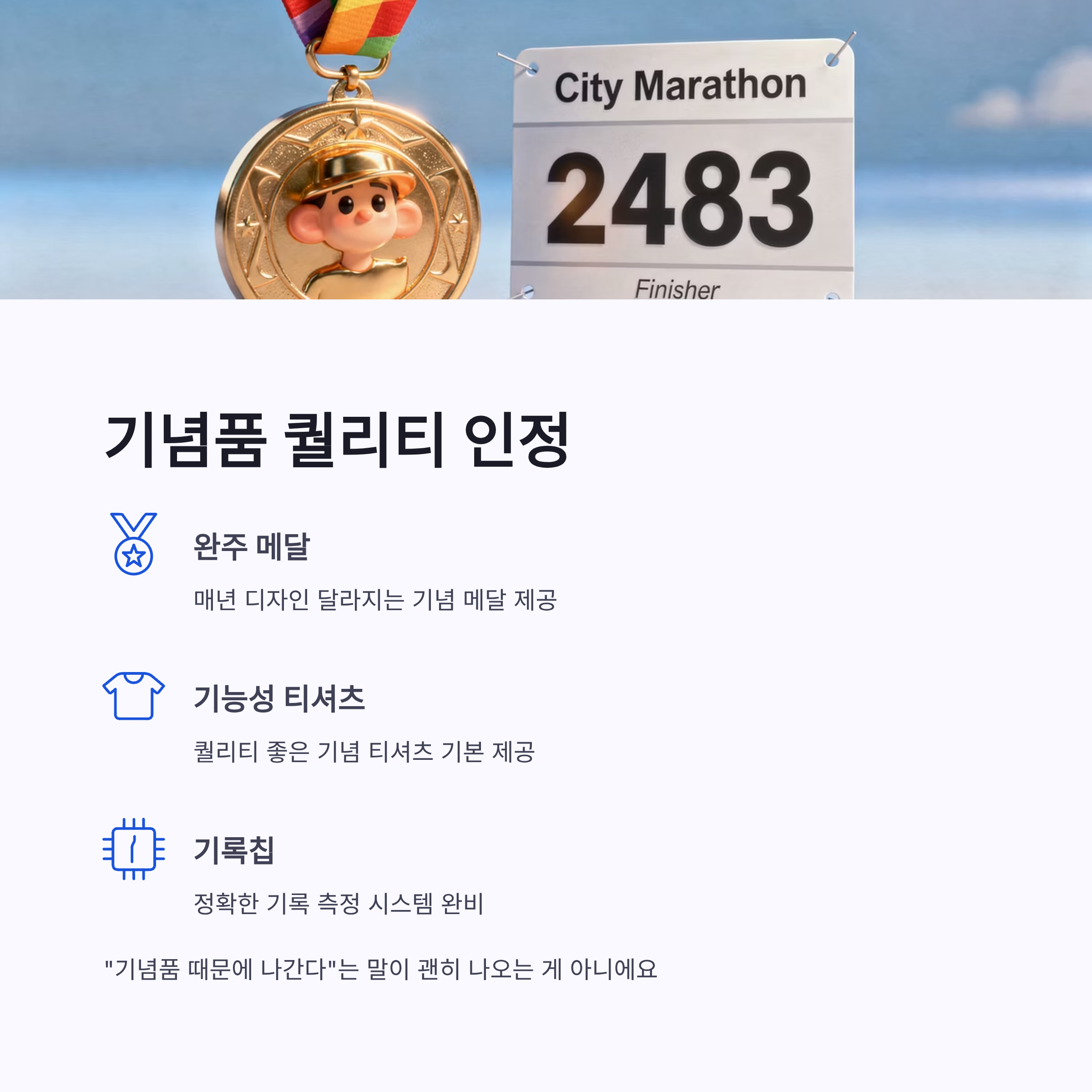 이 대회가 인기 있는 이유 중 하나가 바로 기념품인데요. 공식 발표 기준으로 완주 메달, 기능성 티셔츠, 기록칩 제공은 기본이고, 해마다 퀄리티가 나쁘지 않았어요. “기념품 때문에 나간다”는 말이 괜히 나오는 게 아니더라구요.