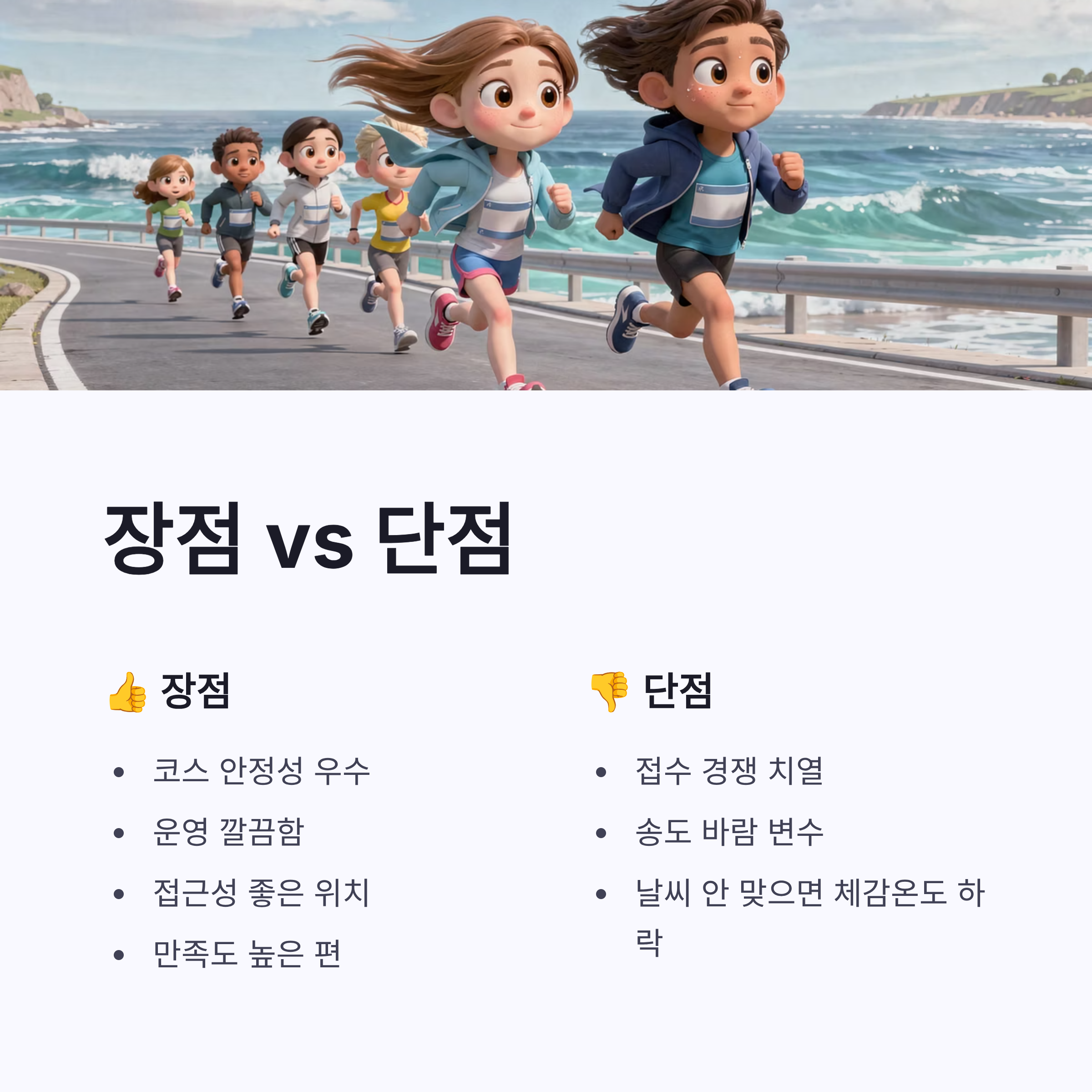 장점은 코스 안정성, 운영 깔끔함, 접근성 좋은 위치. 단점이라면… 접수 경쟁이 치열하다는 점 ㅠㅠ 그리고 송도 특성상 바람이 좀 변수입니다. 날씨 안 맞으면 체감 온도 확 떨어지더라구요. 그래도 전체적으로 보면 2026년 인천국제하프마라톤은 매년 무난하게 만족도 높은 편이라고 느꼈습니다.
