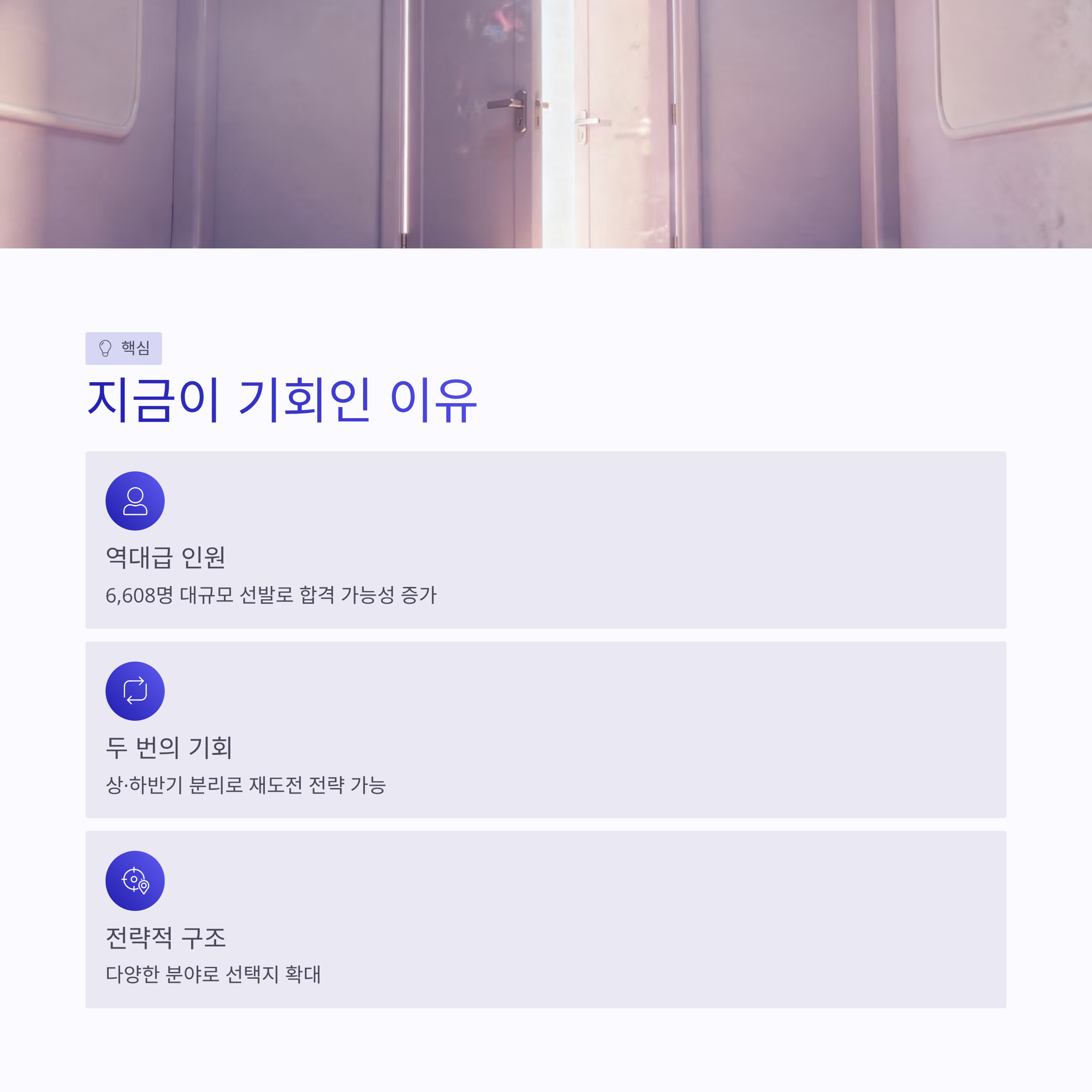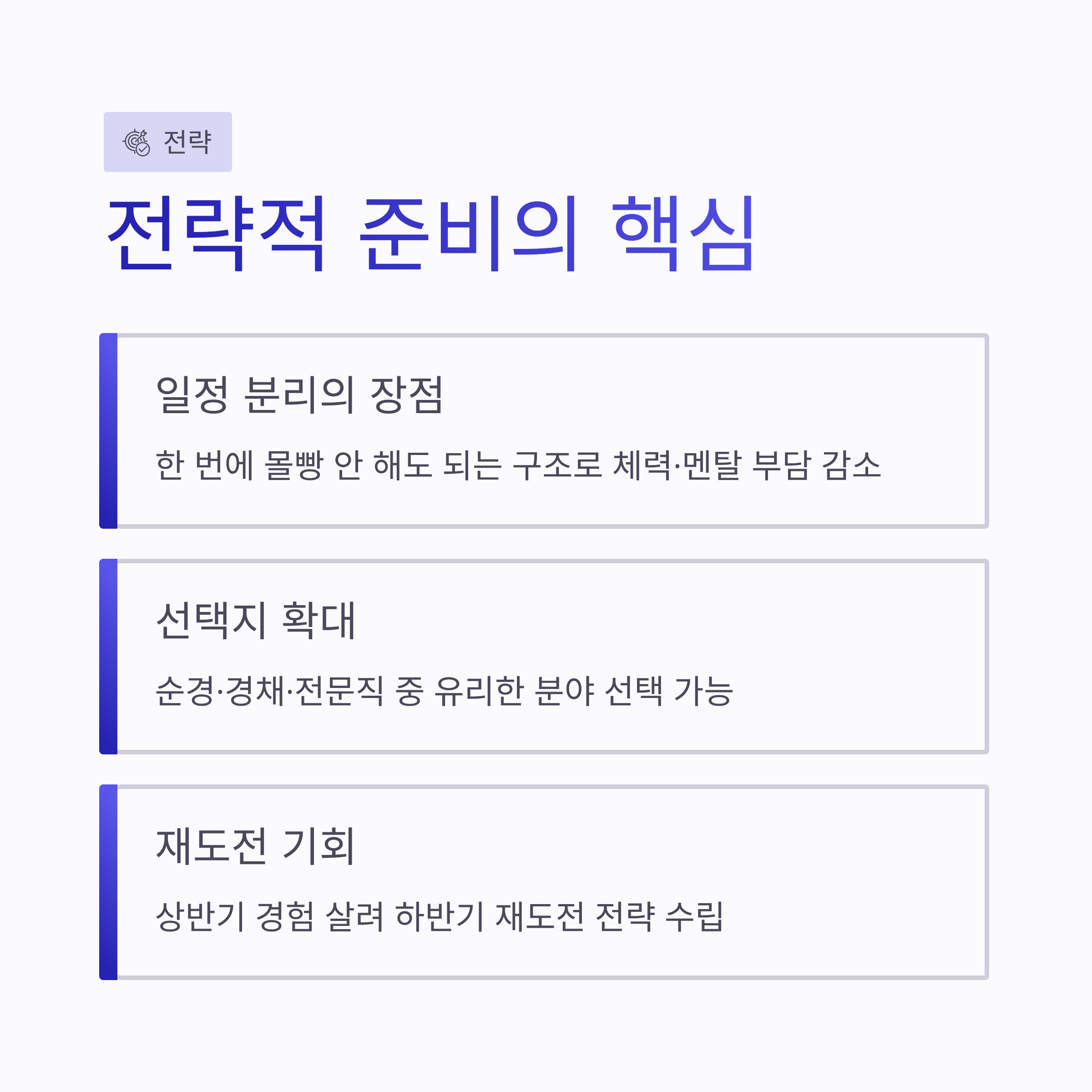 * 선택 폭이 넓어서 전략적 지원 가능 * 전문직·경채는 경쟁률 분산 효과 있음 * 체력 부담이 상대적으로 적은 분야도 존재