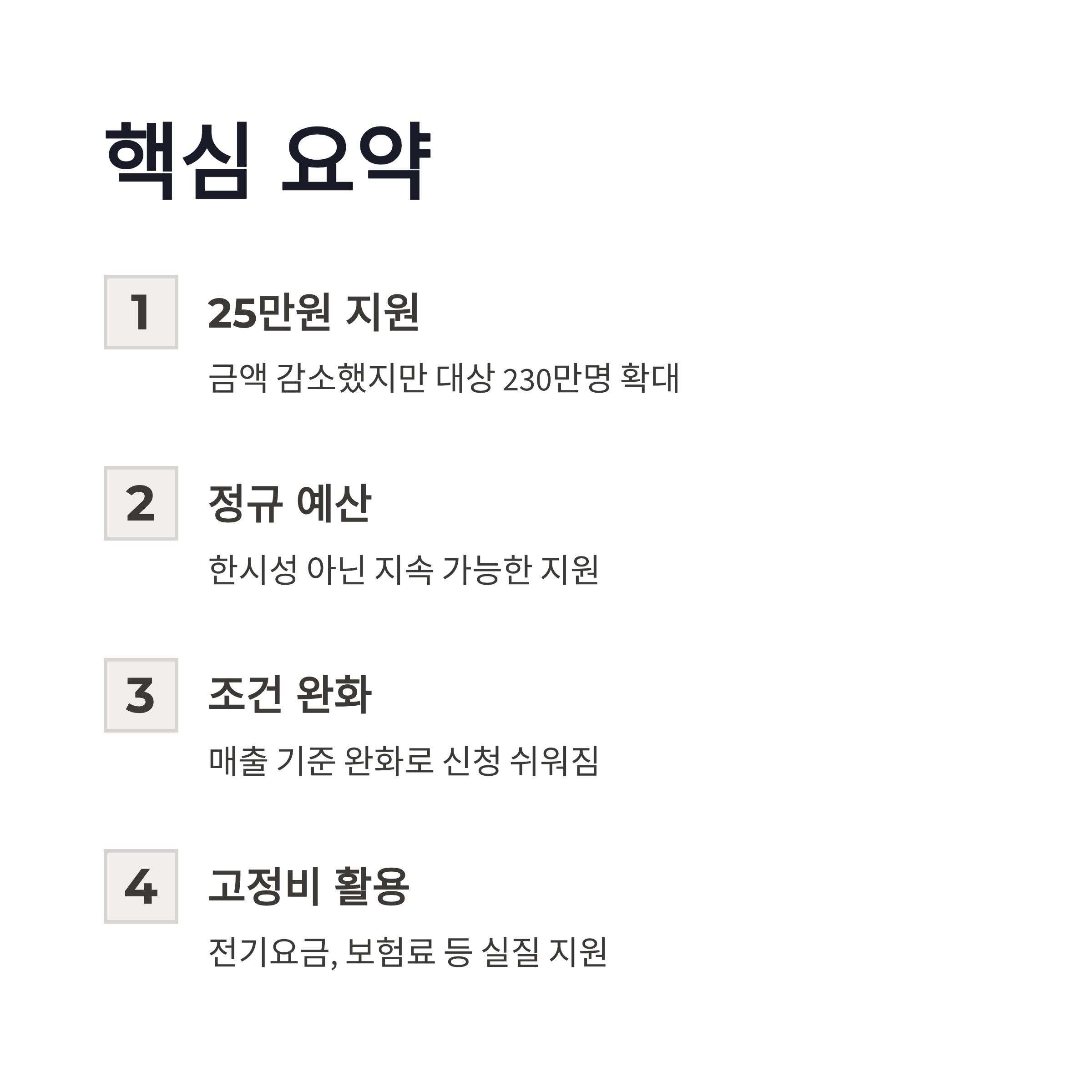 정리해보면, 2026 소상공인 경영안정바우처는 금액은 줄었지만 대상은 역대급 확대입니다. 25만원이 작아 보일 수 있지만, 요즘 같은 시기에 고정비 보전용으로는 충분히 의미 있는 지원이더라구요.