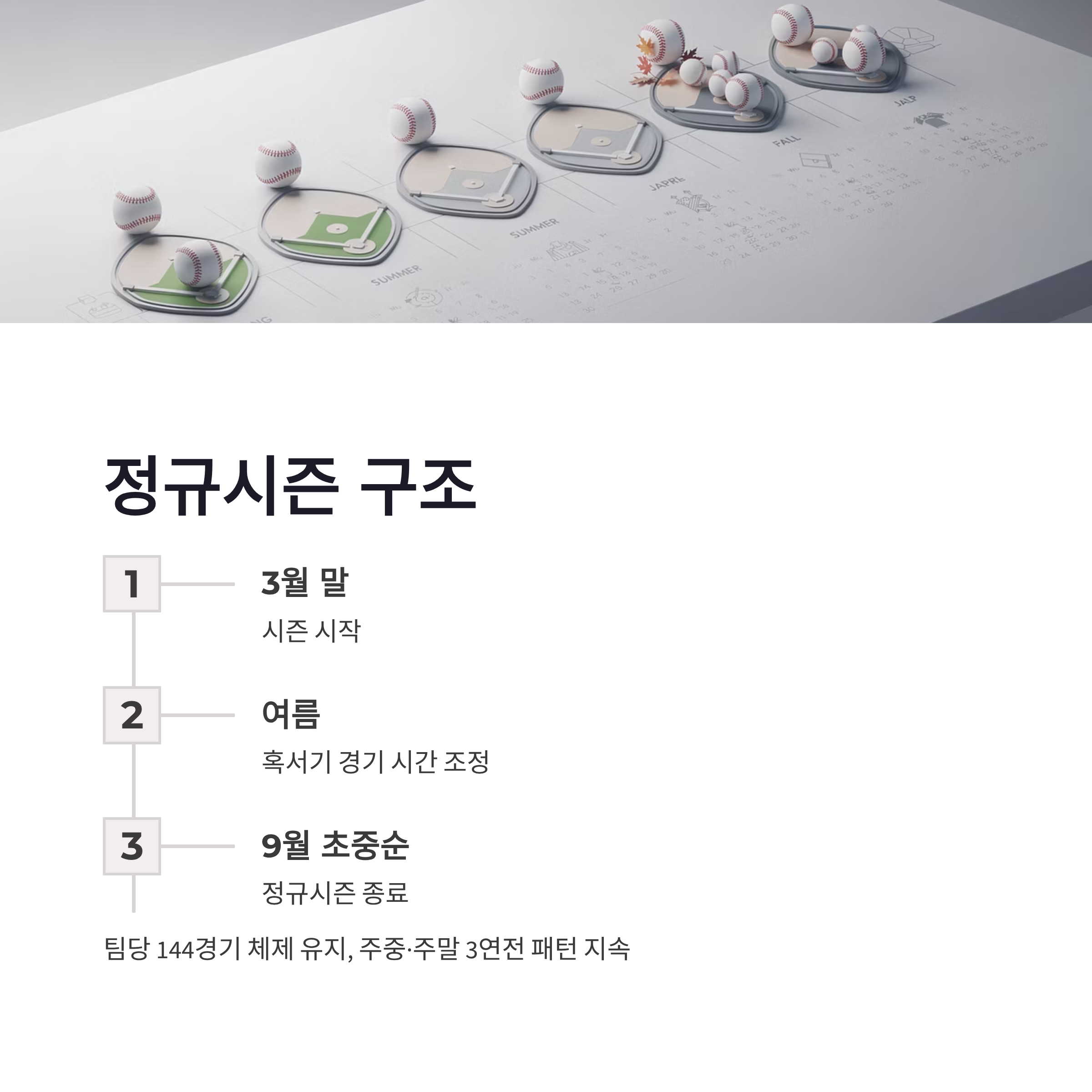정규시즌은 3월 말부터 9월 초중순까지 이어지는 구조입니다. 팀당 144경기 체제 유지, 주중 3연전 + 주말 3연전 패턴도 그대로 갈 가능성이 높아요. 여름 혹서기에는 더블헤더 축소, 경기 시간 조정도 계속 적용될 예정이구요.