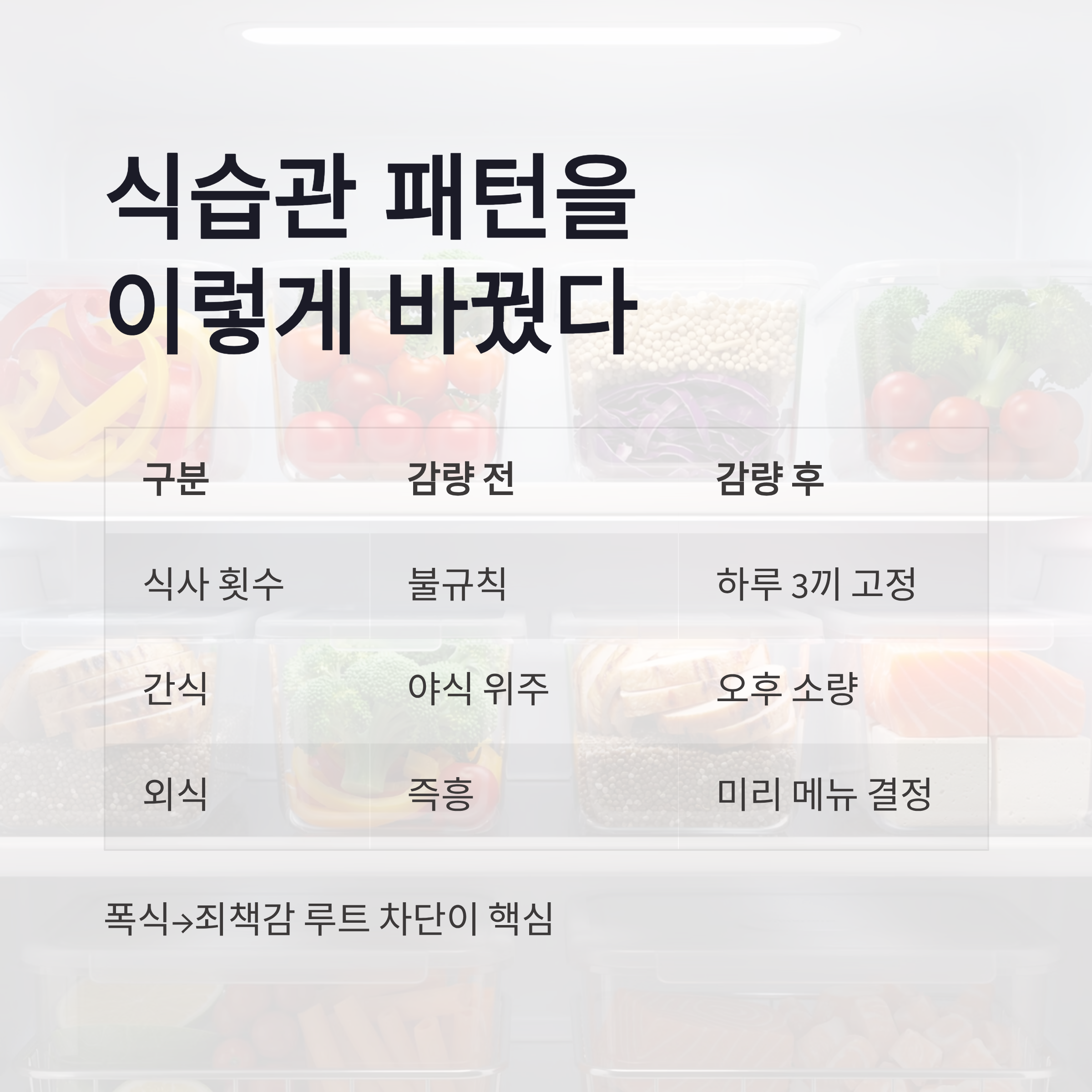 | 식사 횟수 | 불규칙 | 하루 3끼 고정 |