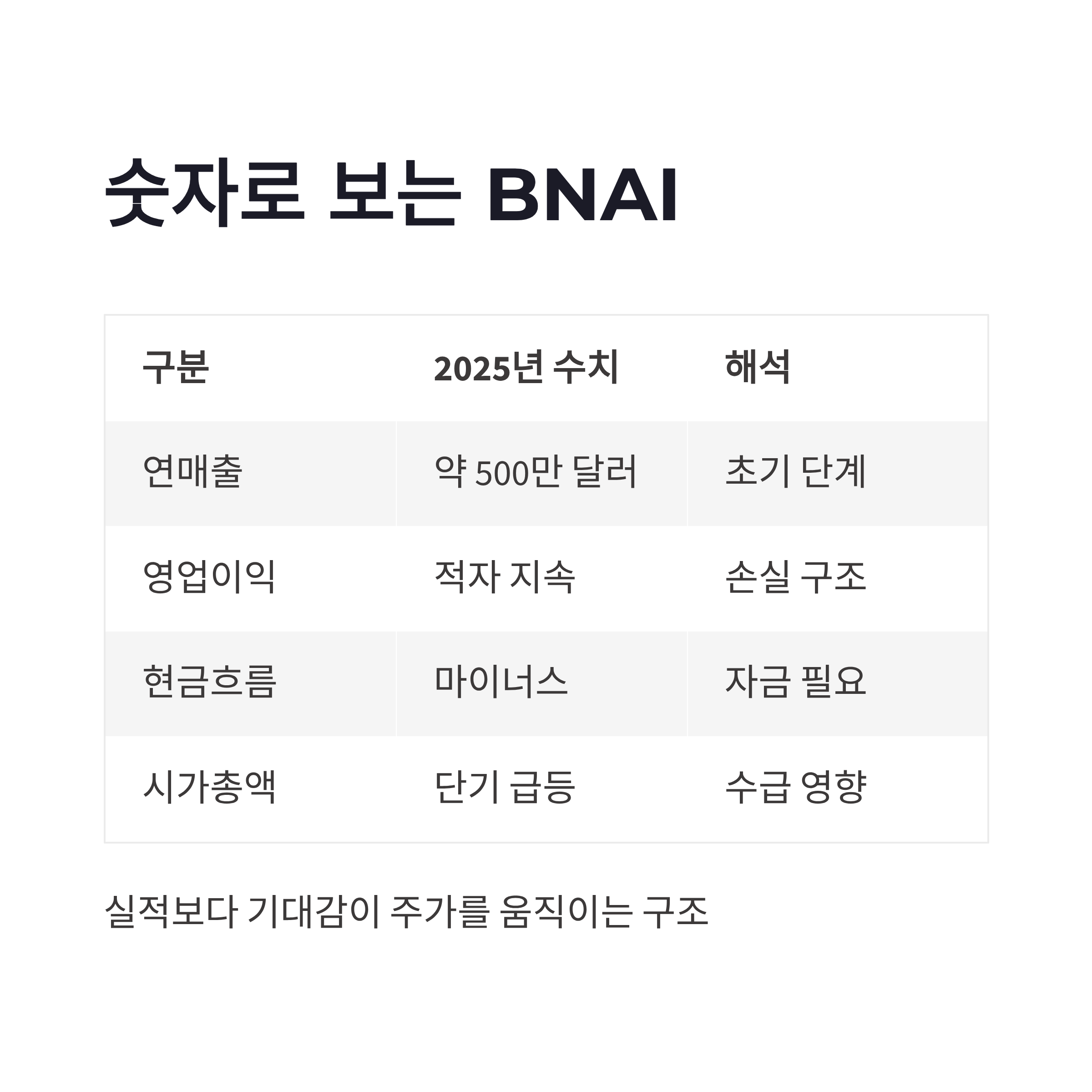 문제는 숫자였습니다. BNAI의 재무 구조를 보면, 매출 규모 자체가 아직 미미한 수준이에요. 2025년 기준 연매출은 수백만 달러 단위에 그쳤고, 영업손실 구조도 그대로 유지 중입니다. 연구개발비 비중이 높다 보니 현금 소모 속도도 빠른 편이었구요.