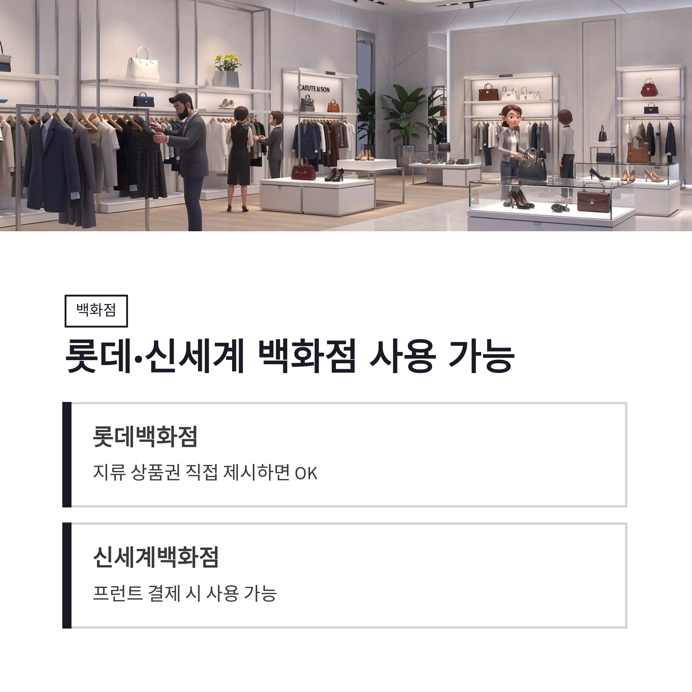 | 백화점 | 롯데백화점, 신세계백화점 | 지류 상품권 직접 제시 |