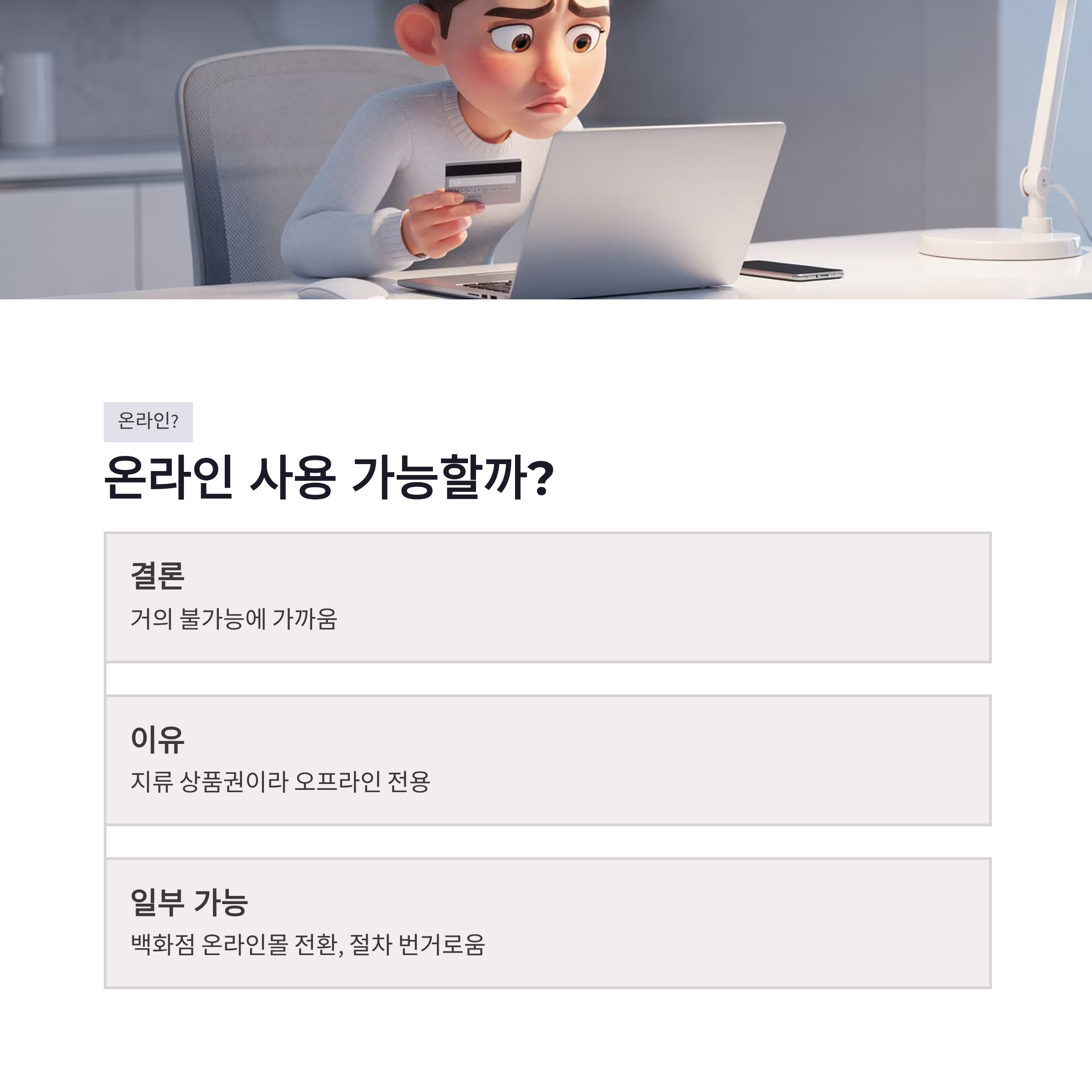 이 부분 질문 진짜 많죠. 결론부터 말하면 SK상품권 온라인 사용은 거의 불가에 가깝습니다. 지류 상품권이라서요. 일부 백화점 온라인몰에서 전환 가능한 경우가 있긴 한데, 절차가 번거롭고 제한도 많았어요. 장점은 오프라인에서 현금처럼 바로 쓸 수 있다는 점이고, 단점은 온라인 쇼핑 위주인 분들에겐 활용도가 떨어진다는 것… 이게 제일 아쉬웠습니다 ㅠㅠ 그래도 주유·외식·백화점 자주 가는 분들에겐 체감 효용은 꽤 큰 편이에요.
